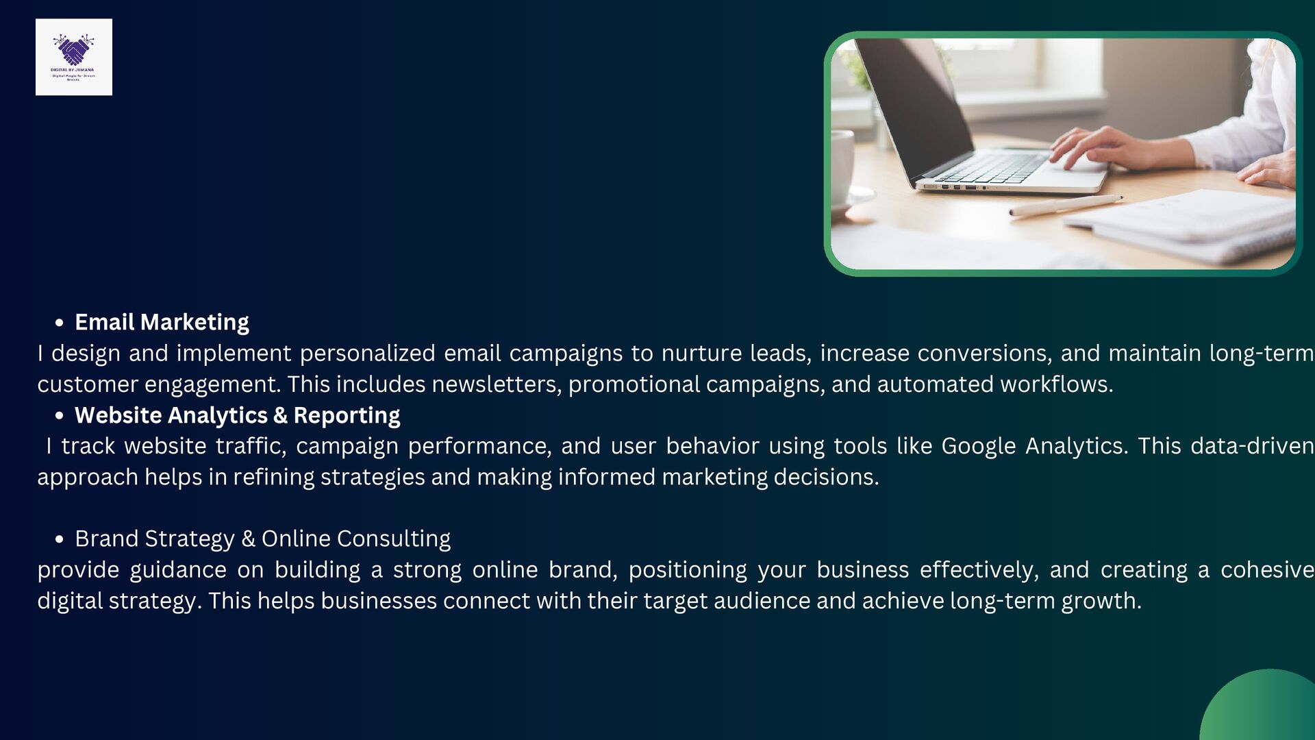 nurture leads, increase conversions, and maintain long-term customer engagement. This includes newsletters, promotional campaigns, and automated workflows. Website Analytics & Reporting I track website traffic, campaign performance, and user behavior using tools like Google Analytics. This data-driven approach helps in refining strategies and making informed marketing decisions. Brand Strategy & Online Consulting provide guidance on building a strong online brand, positioning your business effectively, and creating a cohesive digital strategy. This helps businesses connect with their target audience and achieve long-term growth.