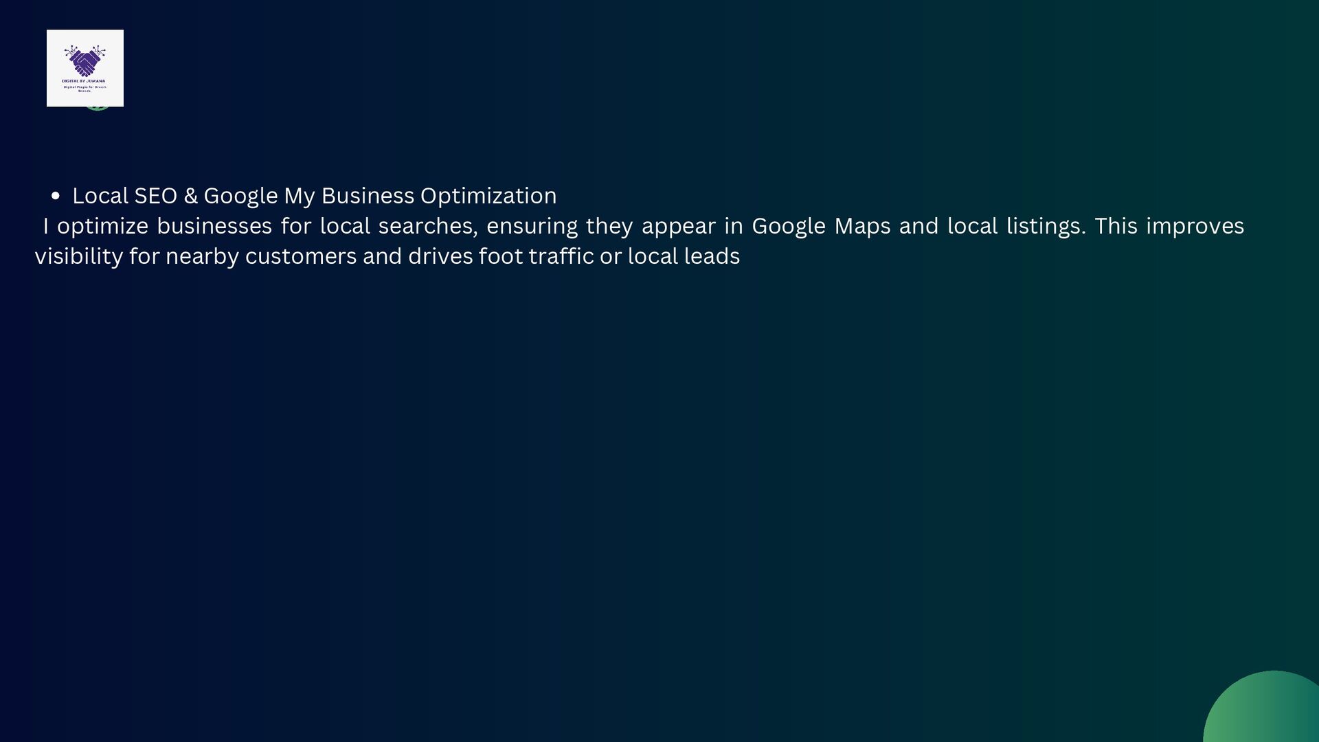 for local searches, ensuring they appear in Google Maps and local listings. This improves visibility for nearby customers and drives foot traffic or local leads