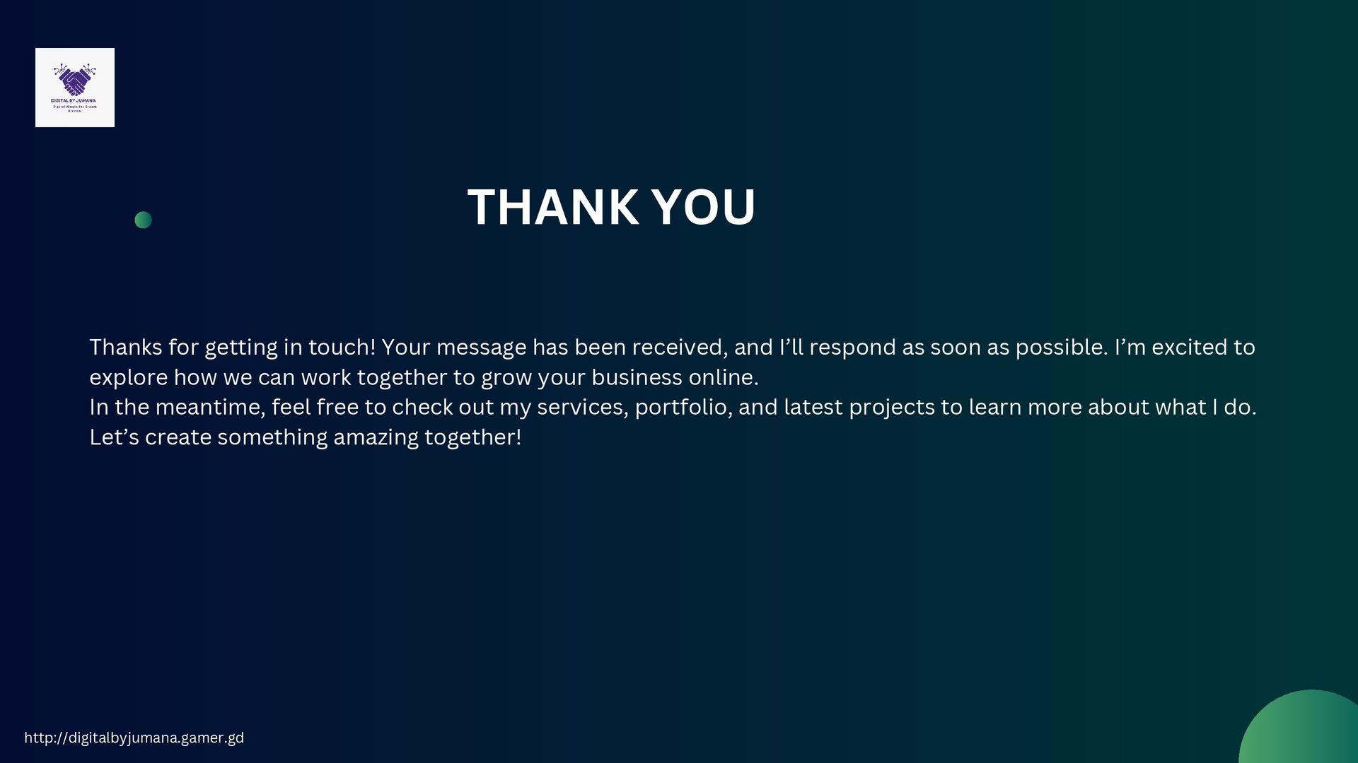 been received, and I’ll respond as soon as possible. I’m excited to explore how we can work together to grow your business online. In the meantime, feel free to check out my services, portfolio, and latest projects to learn more about what I do. Let’s create something amazing together! http://digitalbyjumana.gamer.gd