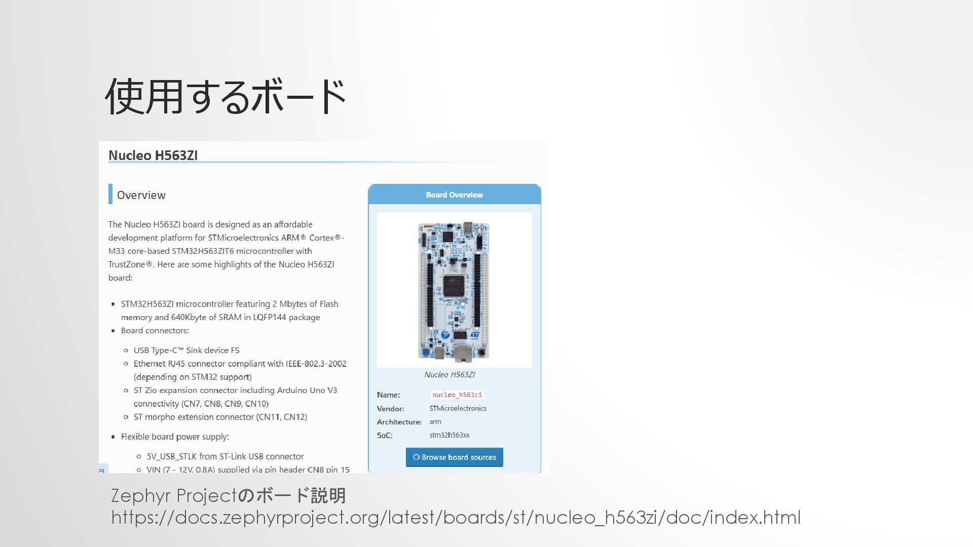 使用するボード Zephyr Projectのボード説明 https://docs.zephyrproject.org/latest/boards/st/nucleo_h563zi/doc/index.html