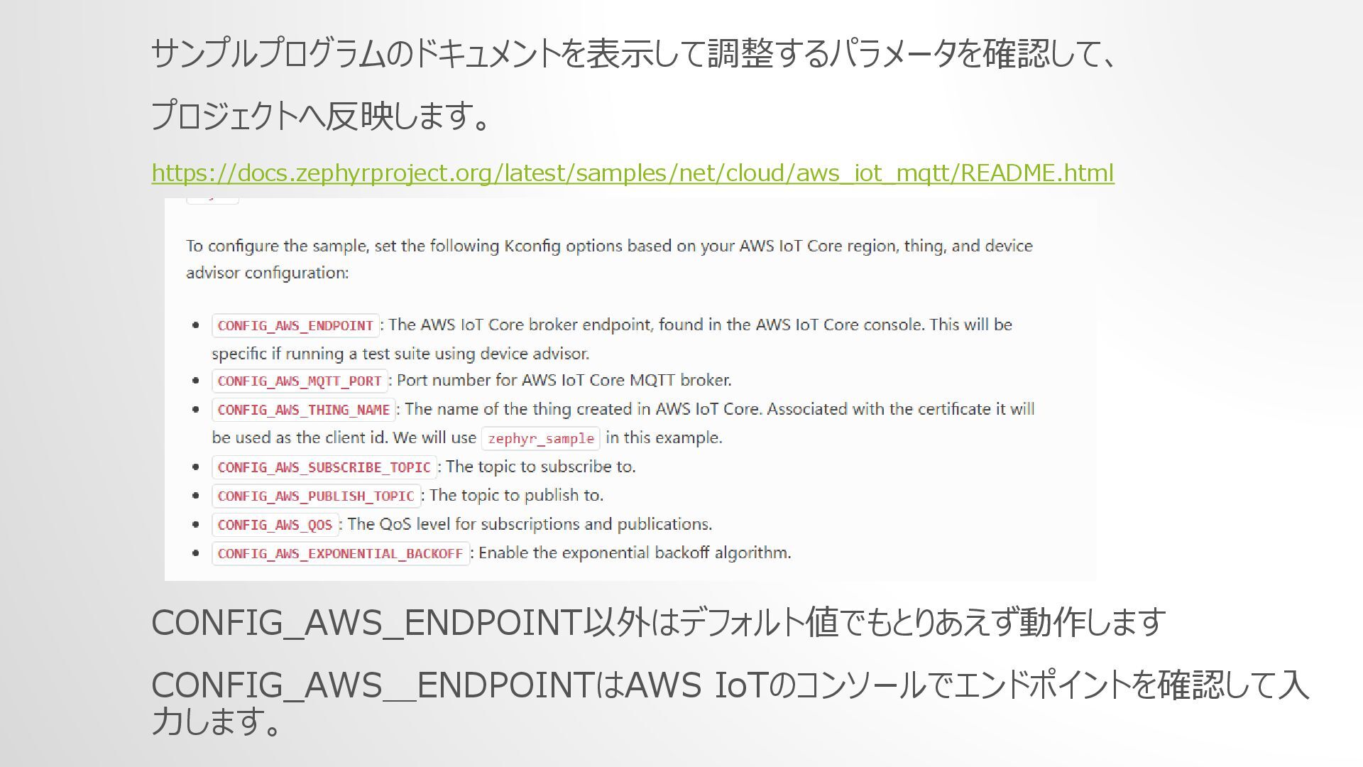 サンプルプログラムのドキュメントを表示して調整するパラメータを確認して、 プロジェクトへ反映します。 https://docs.zephyrproject.org/latest/samples/net/cloud/aws_iot_mqtt/README.html CONFIG_AWS_ENDPOINT以外はデフォルト値でもとりあえず動作します CONFIG_AWS_ENDPOINTはAWS IoTのコンソールでエンドポイントを確認して入 力します。
