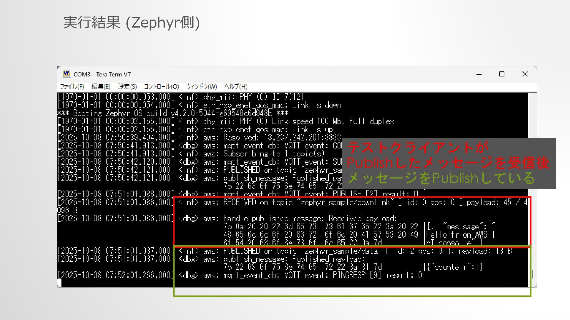 実行結果 (Zephyr側) テストクライアントが Publishしたメッセージを受信後 メッセージをPublishしている