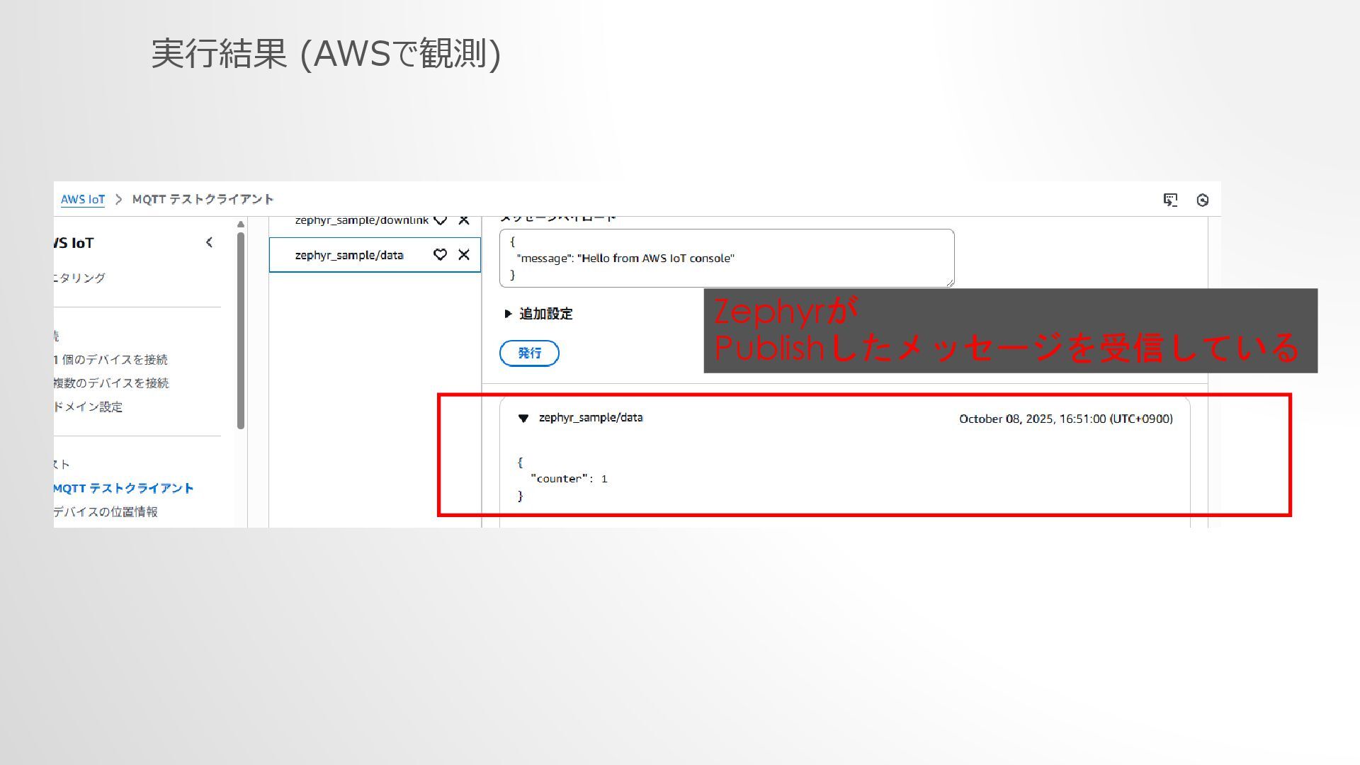 実行結果 (AWSで観測) Zephyrが Publishしたメッセージを受信している
