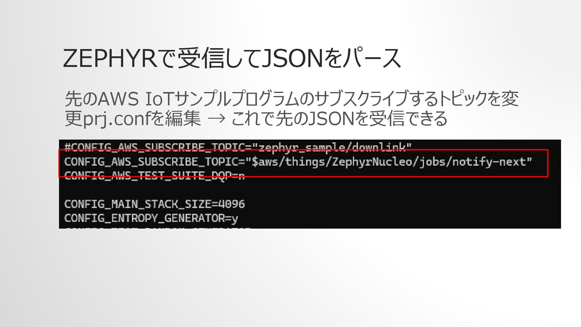 ZEPHYRで受信してJSONをパース 先のAWS IoTサンプルプログラムのサブスクライブするトピックを変 更prj.confを編集 → これで先のJSONを受信できる