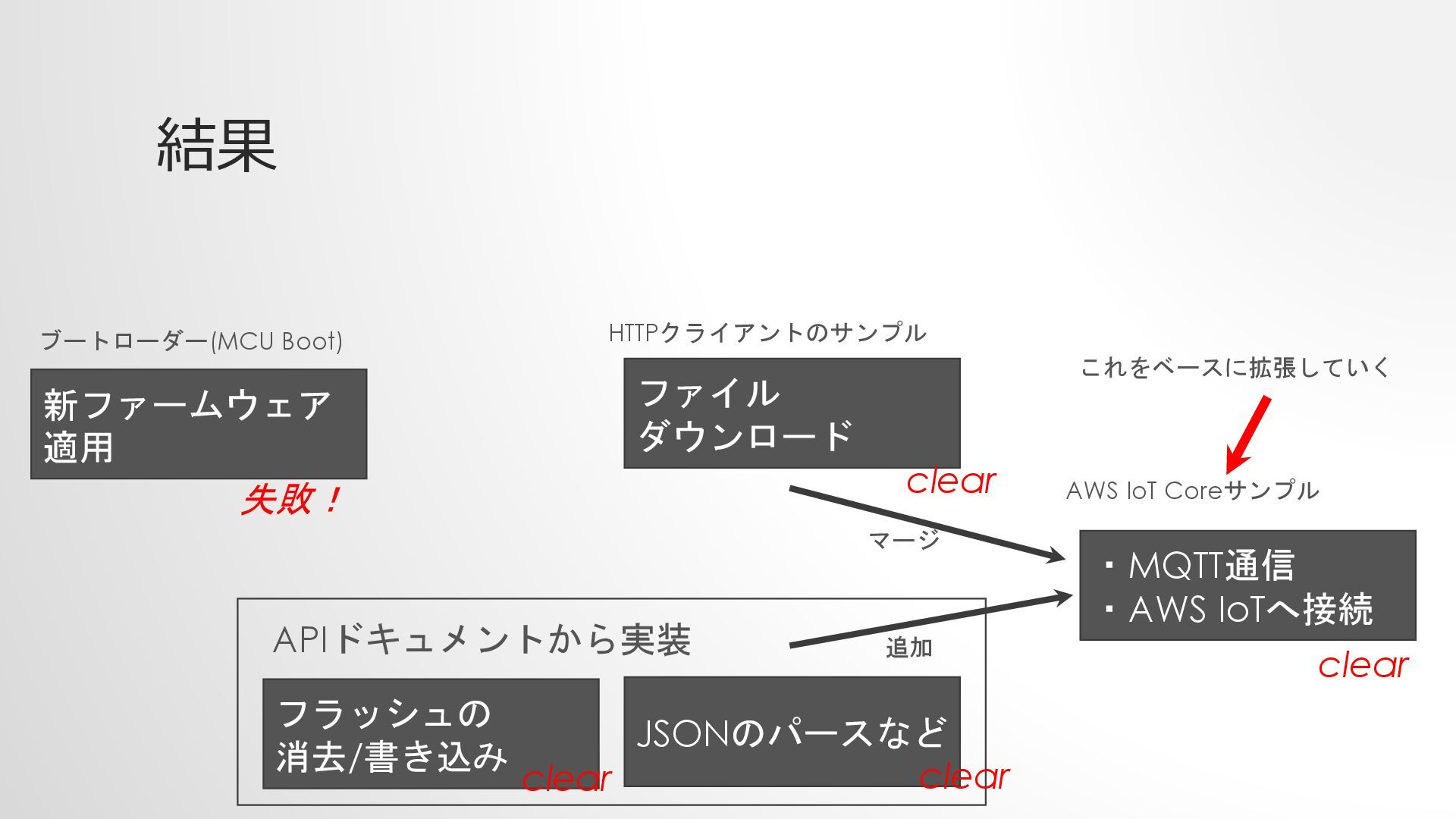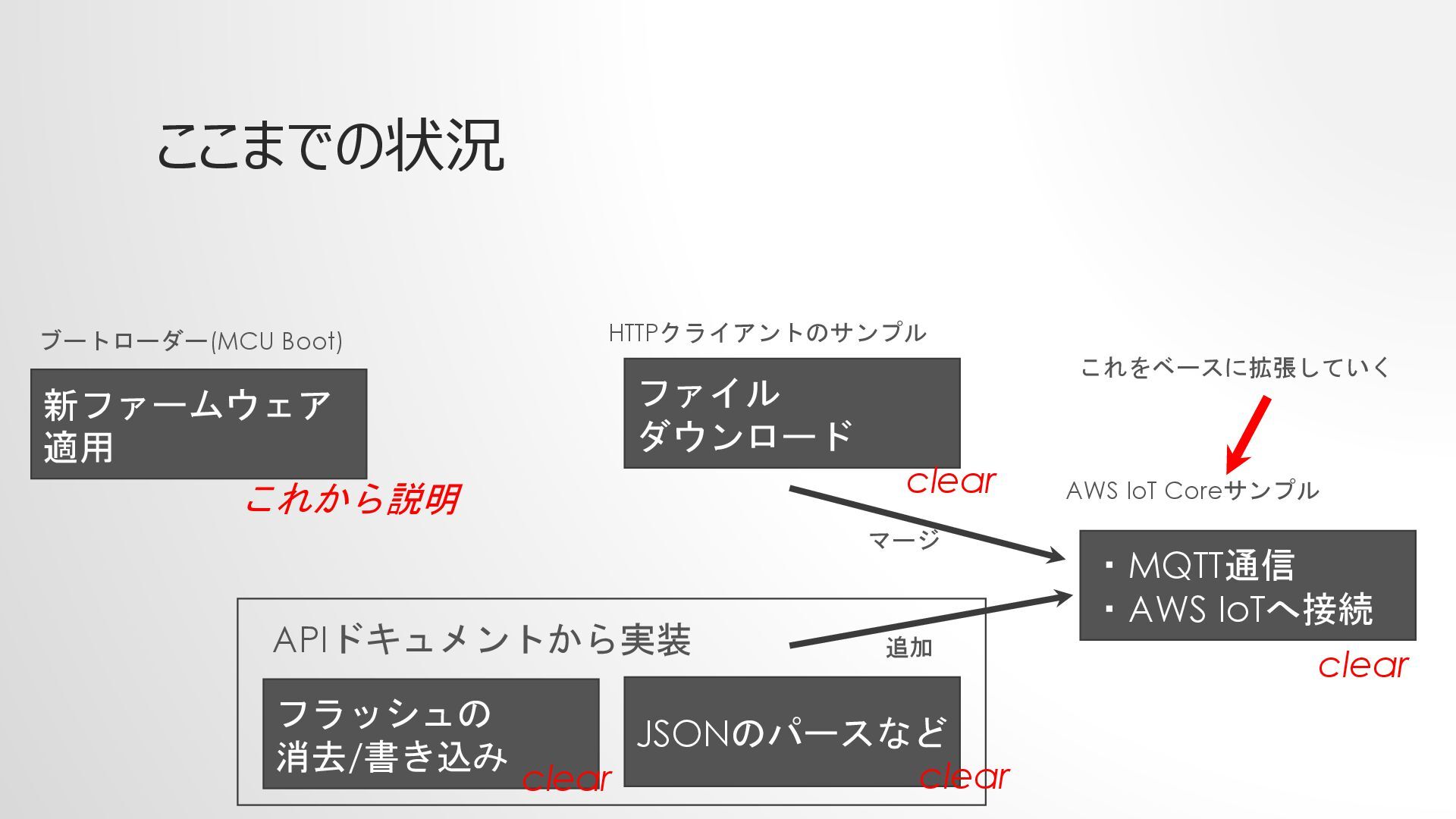 新ファームウェア 適用 ブートローダー(MCU Boot) HTTPクライアントのサンプル AWS IoT Coreサンプル これをベースに拡張していく 追加 マージ clear clear clear clear これから説明