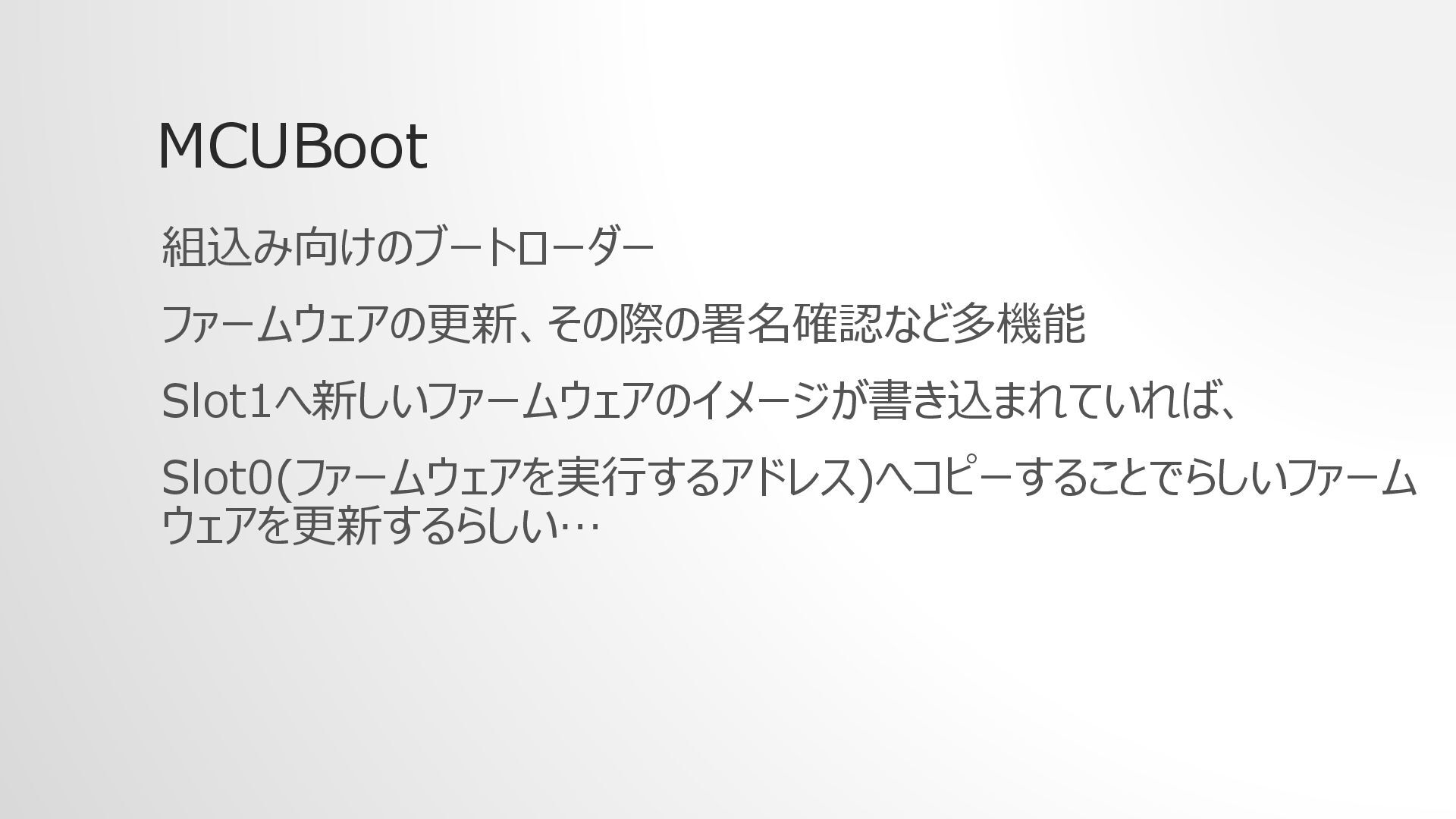 MCUBoot 組込み向けのブートローダー ファームウェアの更新、その際の署名確認など多機能 Slot1へ新しいファームウェアのイメージが書き込まれていれば、 Slot0(ファームウェアを実行するアドレス)へコピーすることでらしいファーム ウェアを更新するらしい…