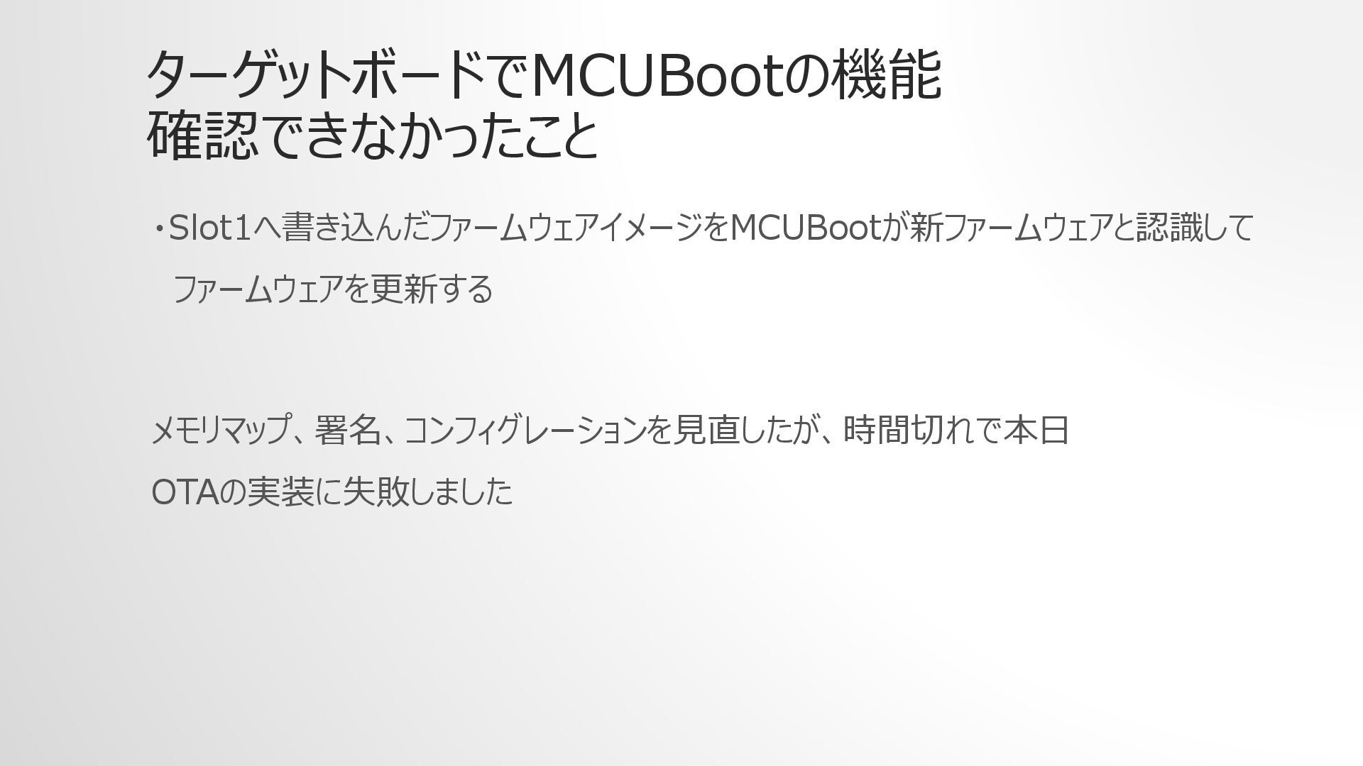 ターゲットボードでMCUBootの機能 確認できなかったこと ・Slot1へ書き込んだファームウェアイメージをMCUBootが新ファームウェアと認識して ファームウェアを更新する メモリマップ、署名、コンフィグレーションを見直したが、時間切れで本日 OTAの実装に失敗しました