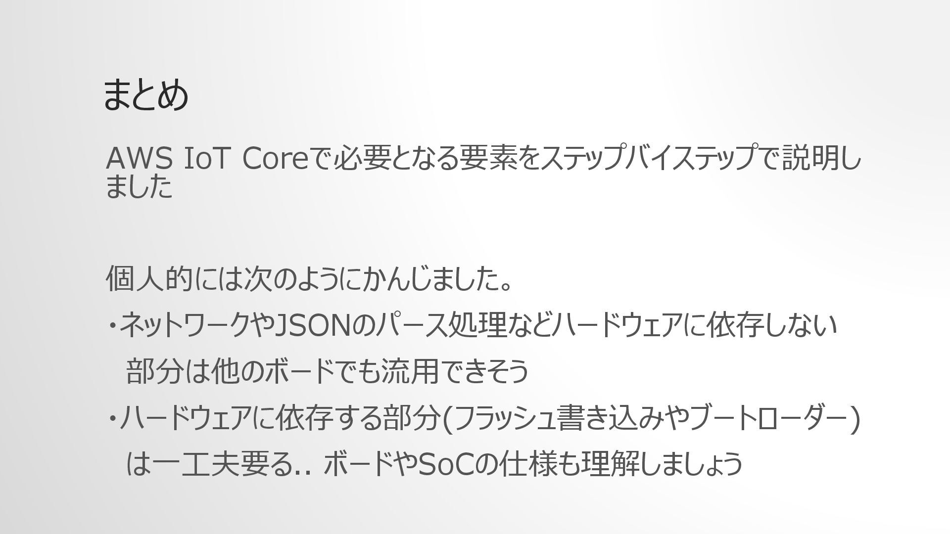 まとめ AWS IoT Coreで必要となる要素をステップバイステップで説明し ました 個人的には次のようにかんじました。 ・ネットワークやJSONのパース処理などハードウェアに依存しない 部分は他のボードでも流用できそう ・ハードウェアに依存する部分(フラッシュ書き込みやブートローダー) は一工夫要る..
