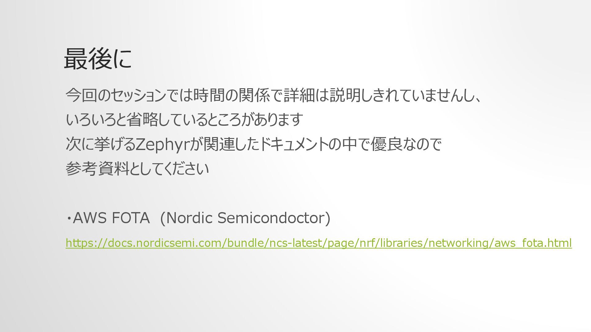 最後に 今回のセッションでは時間の関係で詳細は説明しきれていませんし、 いろいろと省略しているところがあります 次に挙げるZephyrが関連したドキュメントの中で優良なので 参考資料としてください ・AWS FOTA (Nordic Semicondoctor) https://docs.nordicsemi.com/bundle/ncs-latest/page/nrf/libraries/networking/aws_fota.html