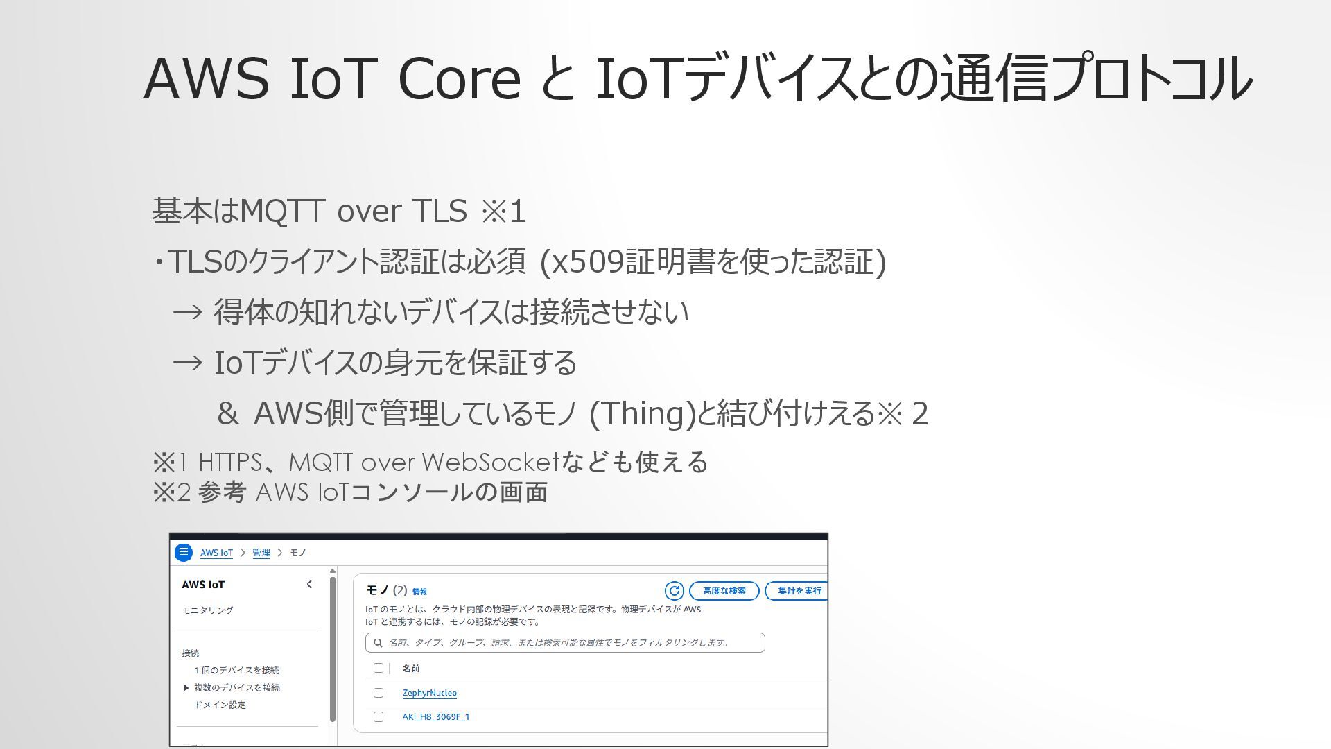 参考 AWS IoTコンソールの画面 基本はMQTT over TLS ※1 ・TLSのクライアント認証は必須 (x509証明書を使った認証) → 得体の知れないデバイスは接続させない → IoTデバイスの身元を保証する & AWS側で管理しているモノ (Thing)と結び付けえる※2