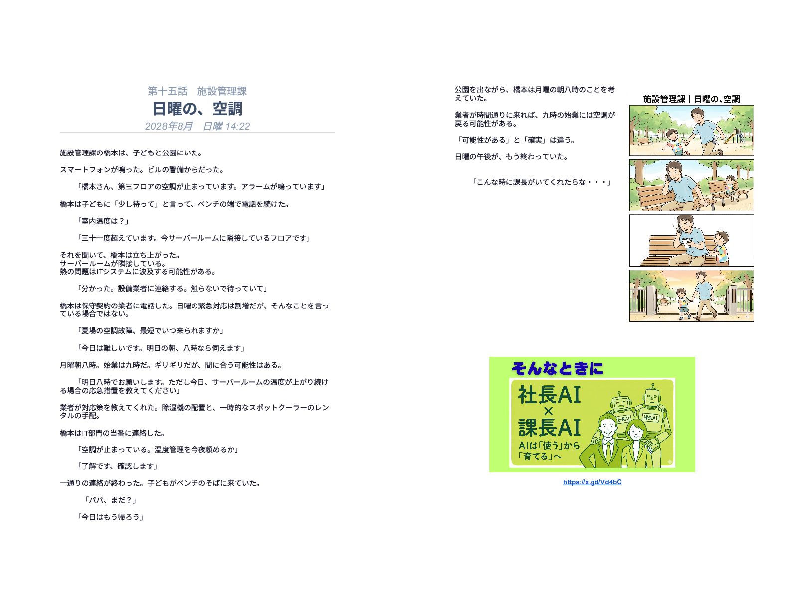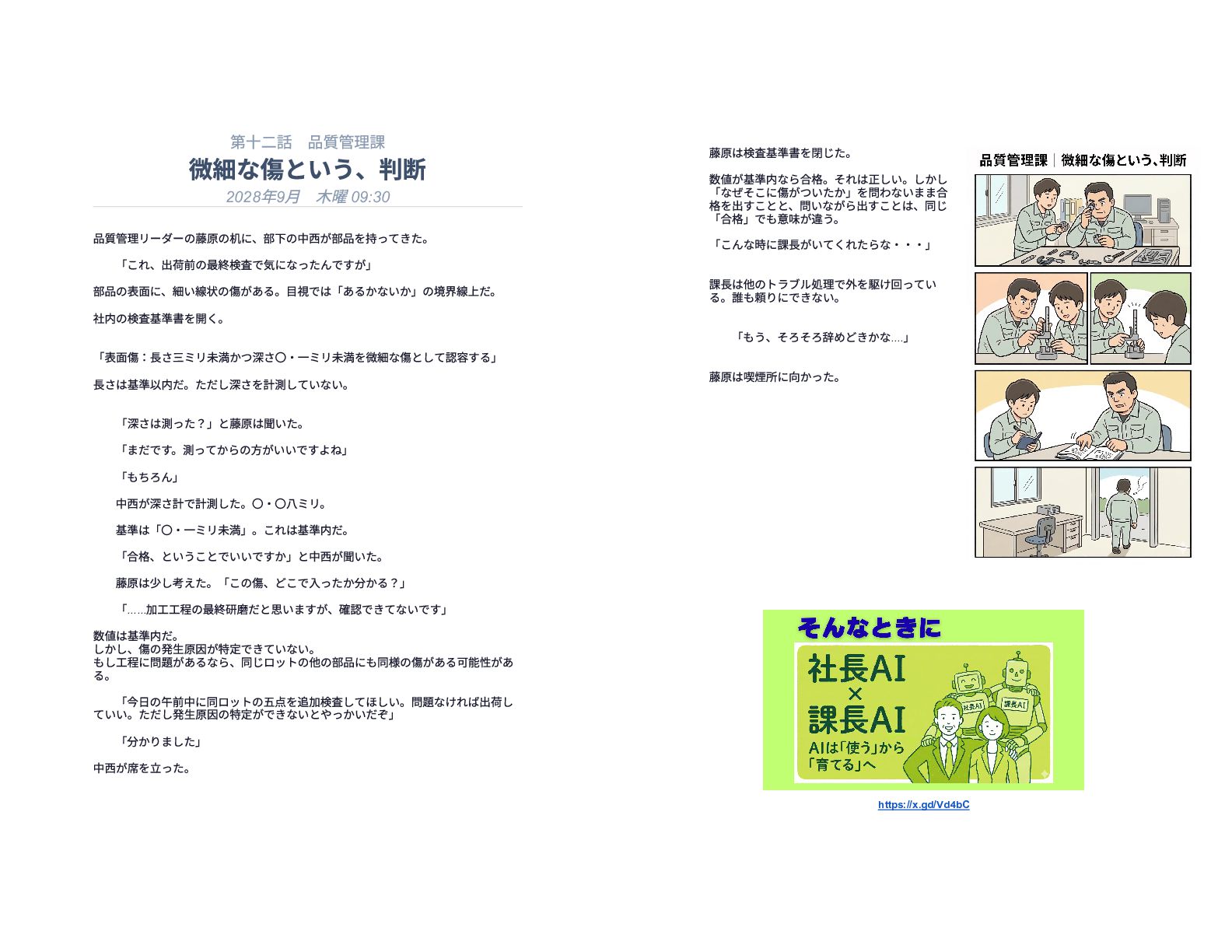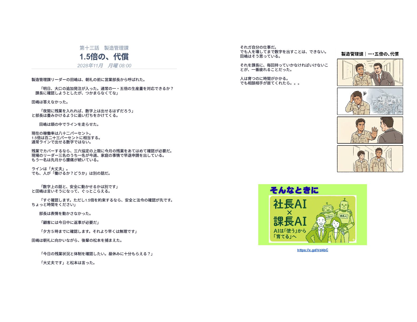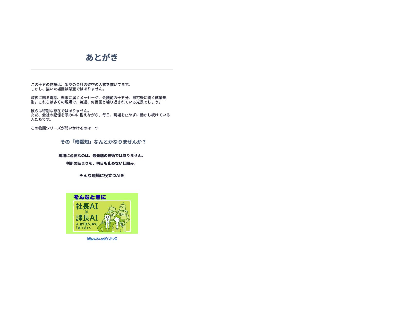 企業の様々な部署で働くリーダー層が直面する、孤独で責任重大な判断の瞬間を15の短編エピソードで描いています。総務や経理、情報システムなどの現場では、深夜や週末であってもマニュアル化できない複雑な課題が突発的に発生し、担当者は不在の課長に代わって一人で決断を下さなければなりません。各物語は、専門知識や過去の経緯といった個人の「暗黙知」に頼り切っている業務現場の危うさを浮き彫りにしています。最終的に本書は、こうした現場の判断の停滞を防ぐための解決策として、AIを活用した仕組み作りの重要性を提言しています。知識を共有し、誰もが迷わず動ける組織を目指すためのビジネス寓話集です。