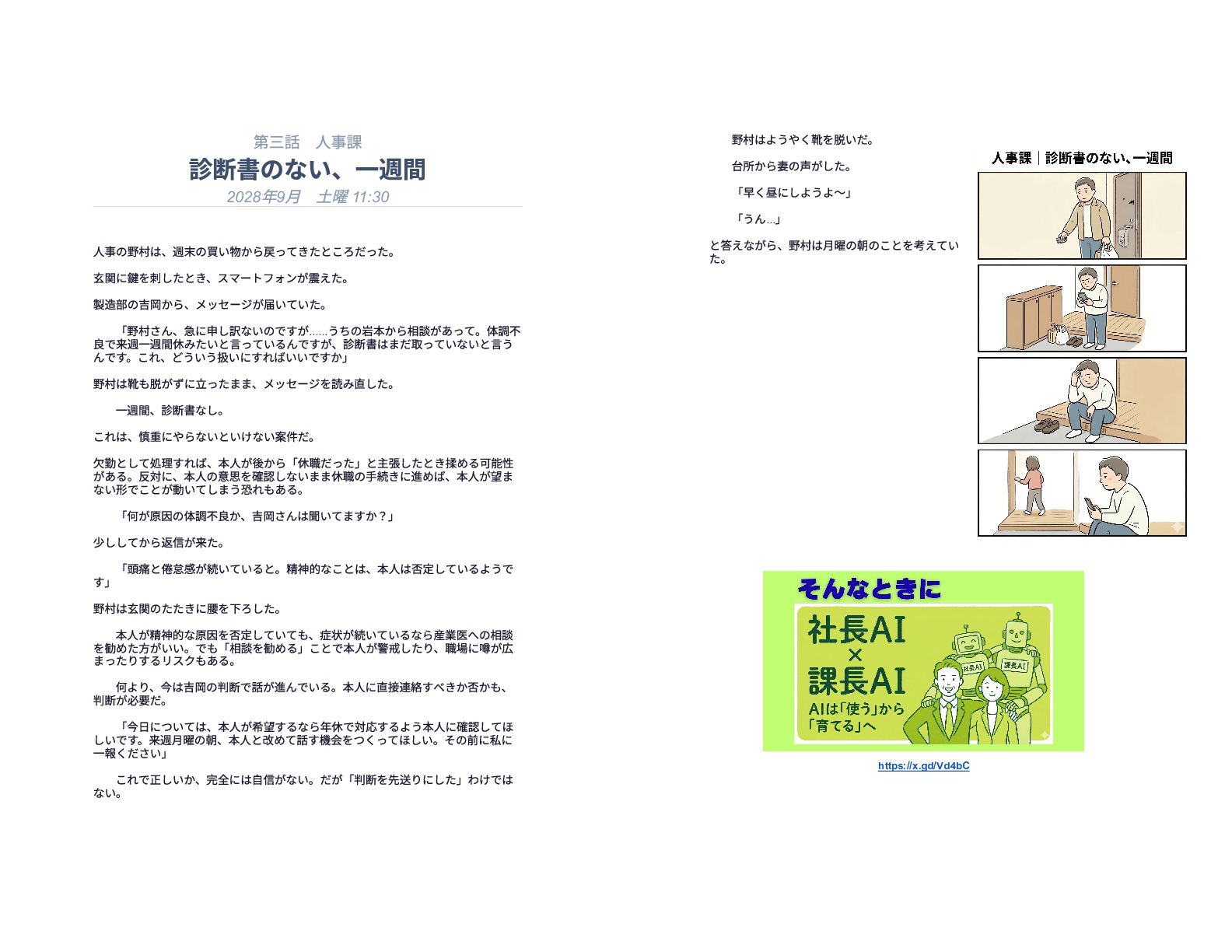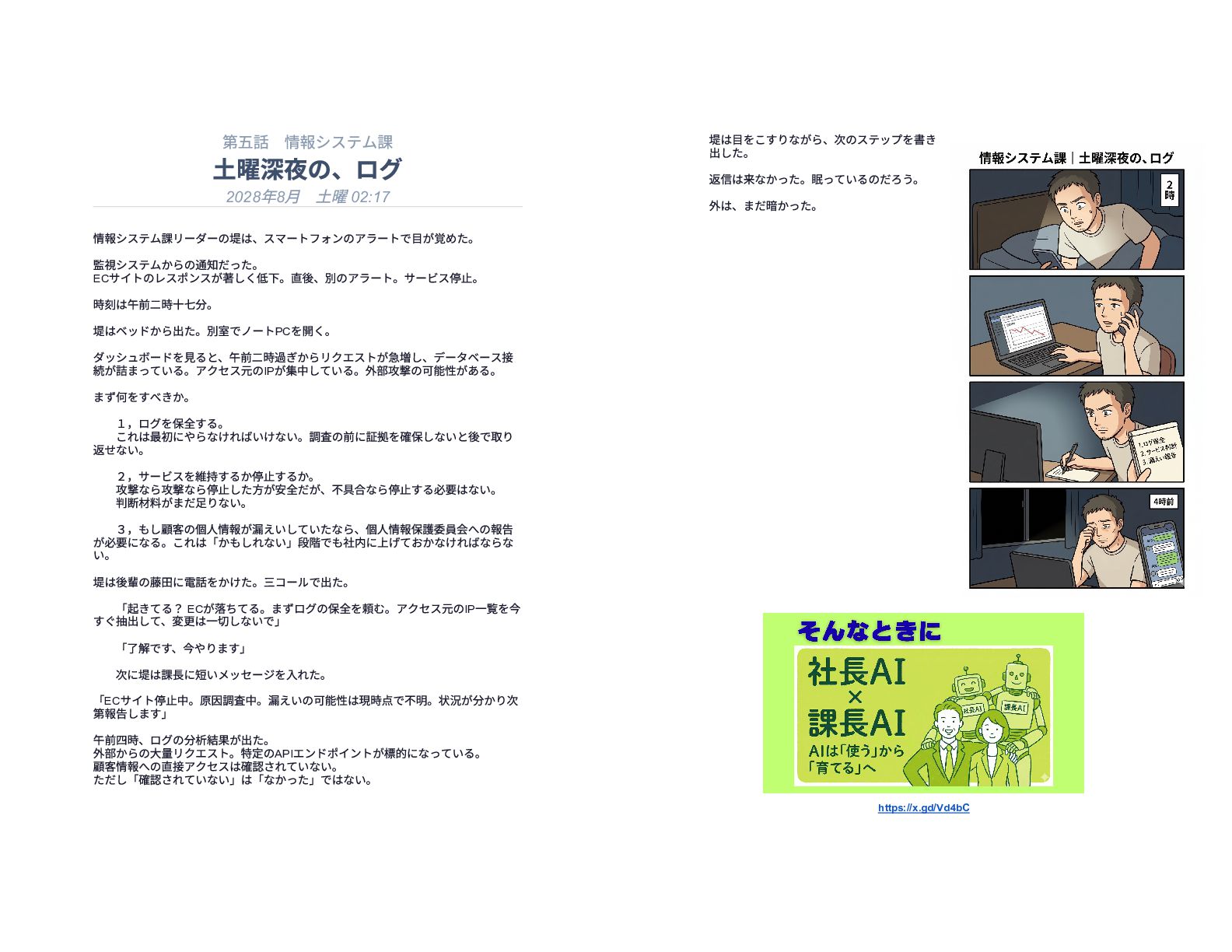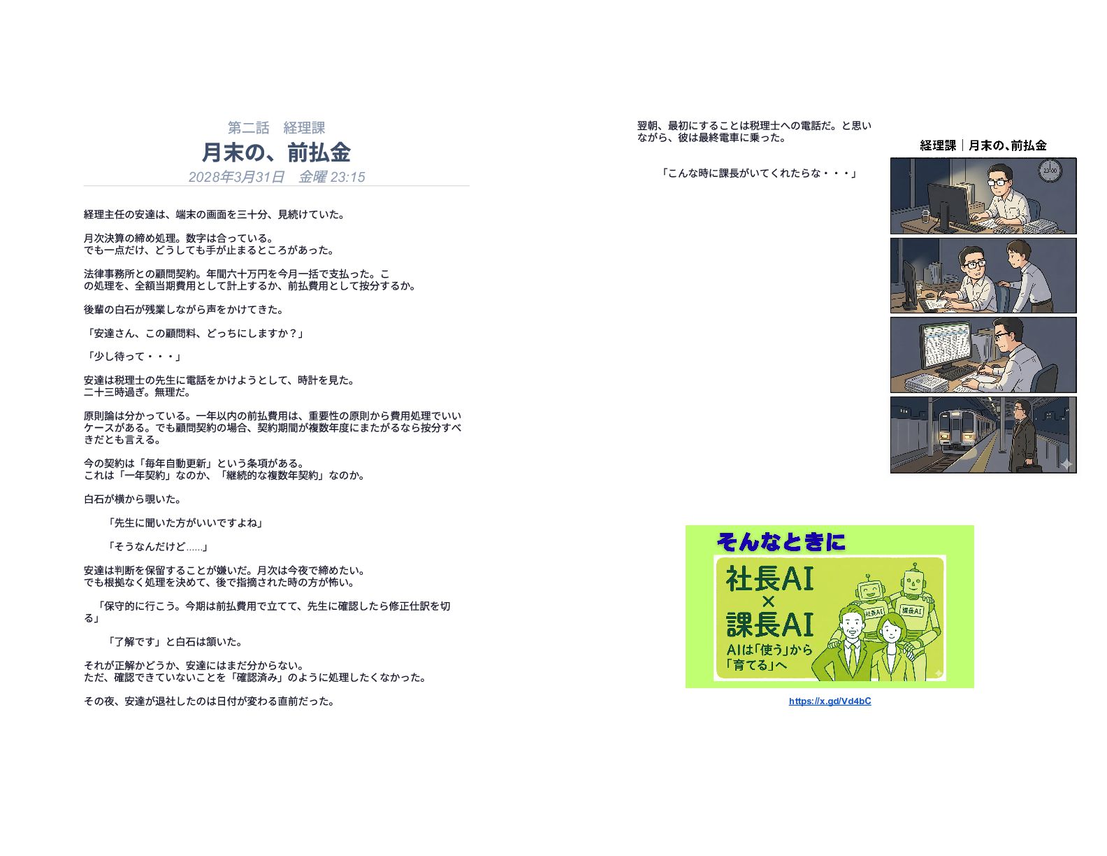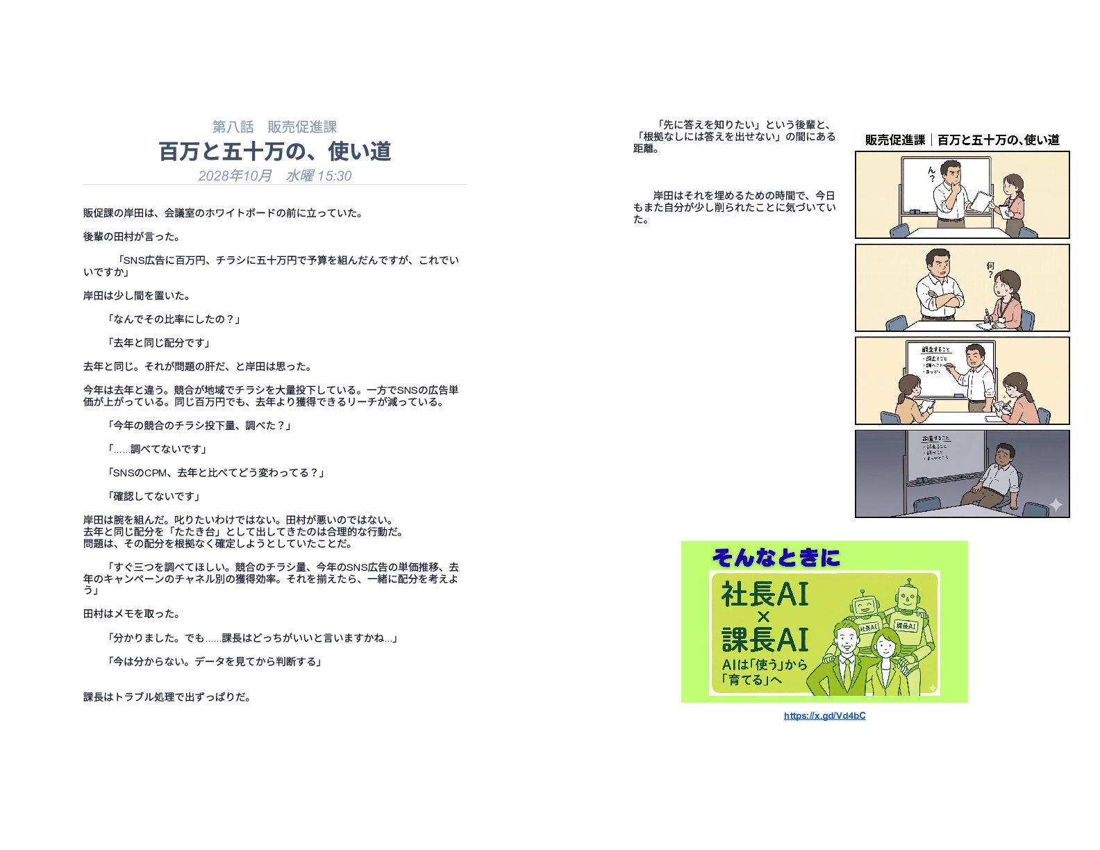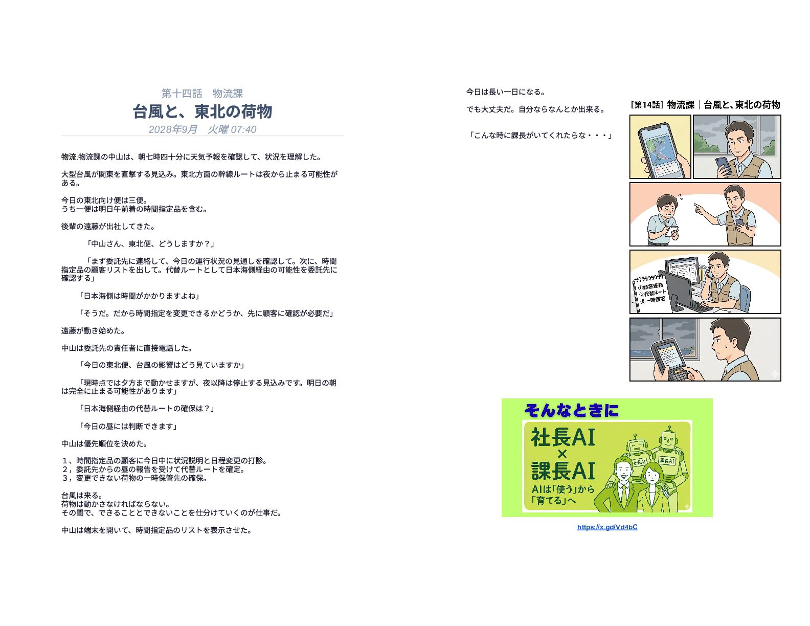 企業の様々な部署で働くリーダー層が直面する、孤独で責任重大な判断の瞬間を15の短編エピソードで描いています。総務や経理、情報システムなどの現場では、深夜や週末であってもマニュアル化できない複雑な課題が突発的に発生し、担当者は不在の課長に代わって一人で決断を下さなければなりません。各物語は、専門知識や過去の経緯といった個人の「暗黙知」に頼り切っている業務現場の危うさを浮き彫りにしています。最終的に本書は、こうした現場の判断の停滞を防ぐための解決策として、AIを活用した仕組み作りの重要性を提言しています。知識を共有し、誰もが迷わず動ける組織を目指すためのビジネス寓話集です。