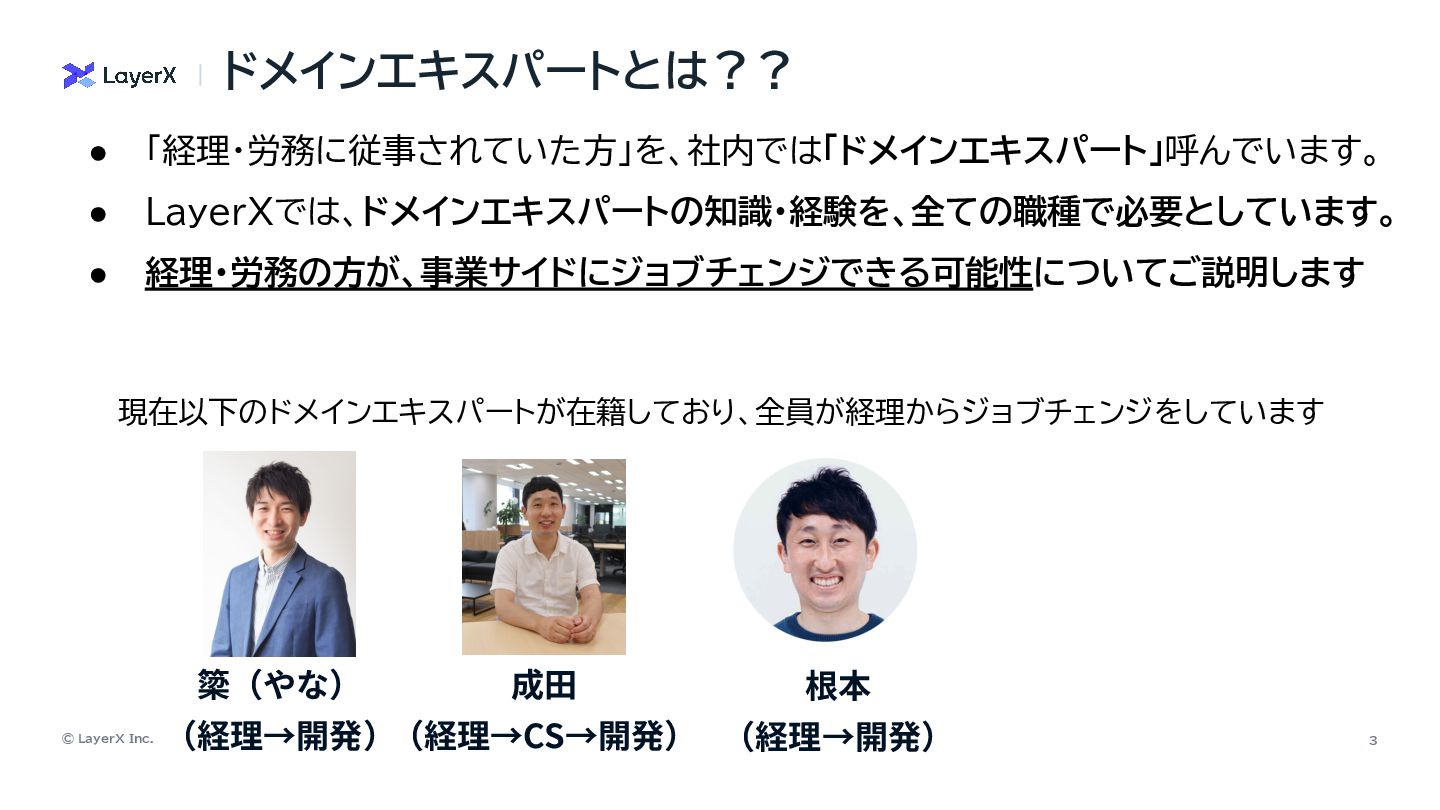 経理・労務の方が、事業サイドにジョブチェンジできる可能性についてご説明します 現在以下のドメインエキスパートが在籍しており、全員が経理からジョブチェンジをしています 成⽥ (経理→CS→開発) 簗(やな) (経理→開発) 根本 (経理→開発)
