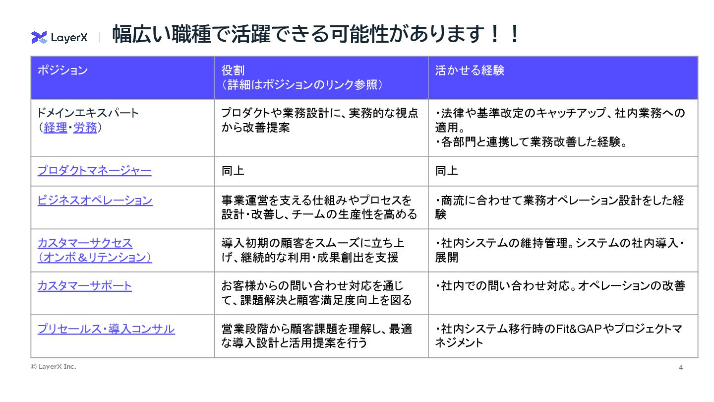 © LayerX Inc. 3 ドメインエキスパートとは?? • 「経理・労務に従事されていた方」を、社内では「ドメインエキスパート」呼んでいます。 • LayerXでは、ドメインエキスパートの知識・経験を、全ての職種で必要としています。 •