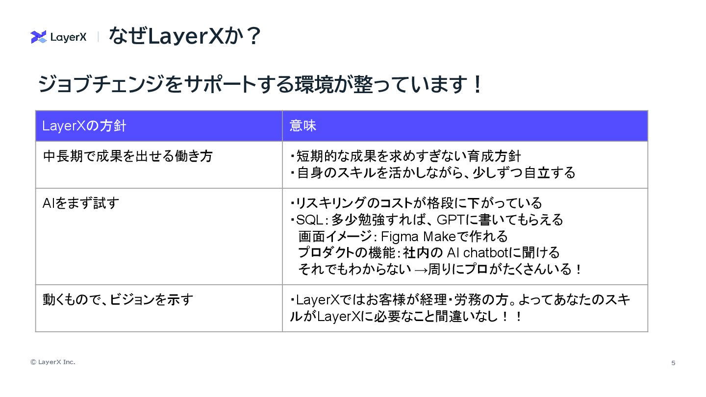AIをまず試す ・リスキリングのコストが格段に下がっている ・SQL:多少勉強すれば、GPTに書いてもらえる 画面イメージ:Figma Makeで作れる プロダクトの機能:社内の AI chatbotに聞ける それでもわからない →周りにプロがたくさんいる! 動くもので、ビジョンを示す ・LayerXではお客様が経理・労務の方。よってあなたのスキ ルがLayerXに必要なこと間違いなし!! ジョブチェンジをサポートする環境が整っています!