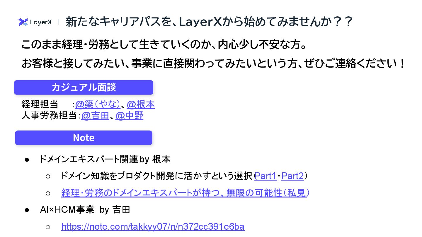 ドメイン知識をプロダクト開発に活かすという選択( Part1・Part2) ◦ 経理・労務のドメインエキスパートが持つ、無限の可能性(私見) • AI×HCM事業 by 吉田 ◦ https://note.com/takkyy07/n/n372cc391e6ba カジュアル⾯談 経理担当 :@簗(やな)、@根本 人事労務担当:@吉田、@中野 新たなキャリアパスを、LayerXから始めてみませんか?? このまま経理・労務として生きていくのか、内心少し不安な方。 お客様と接してみたい、事業に直接関わってみたいという方、ぜひご連絡ください!