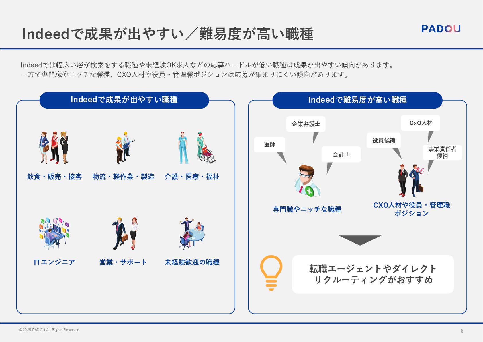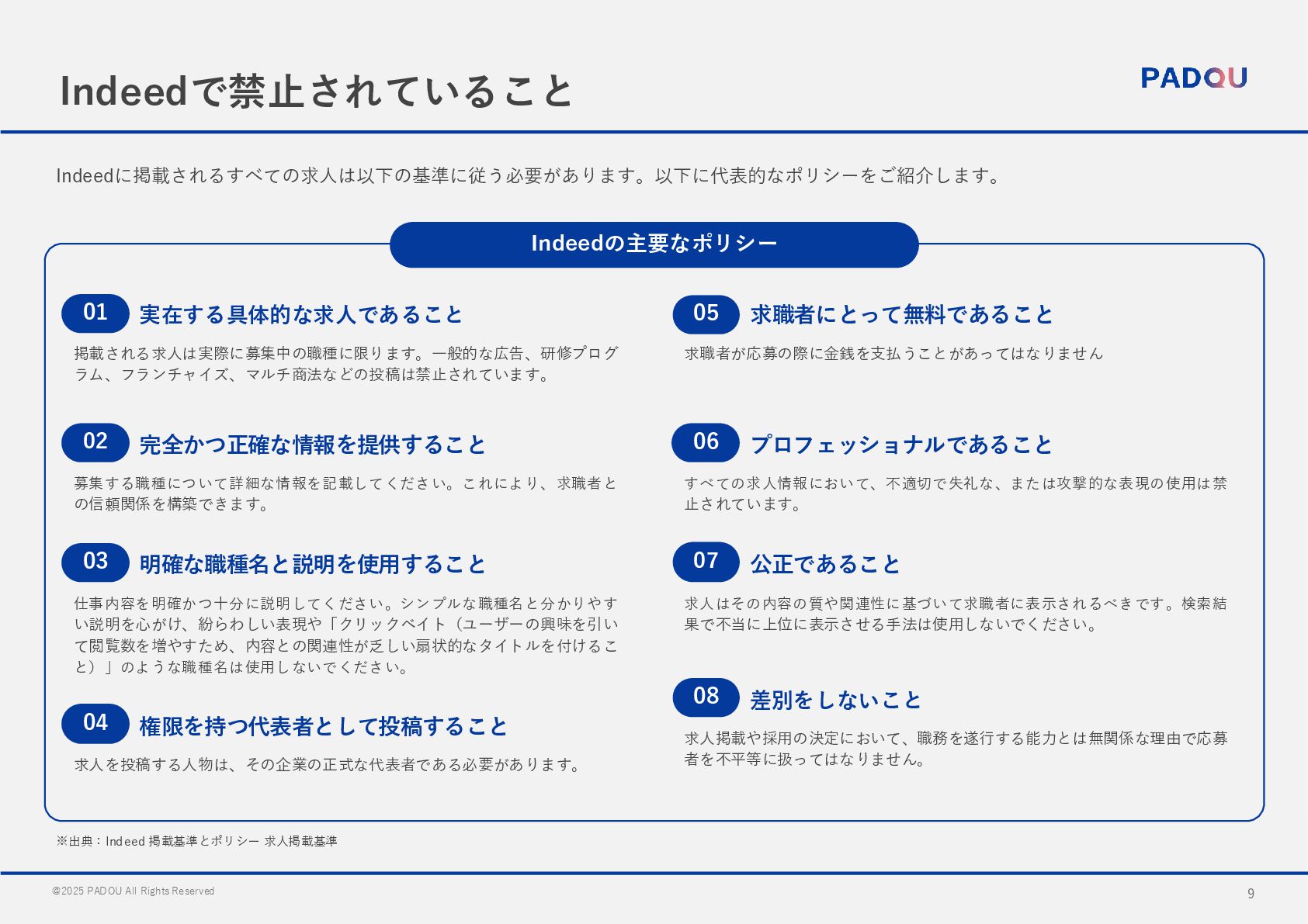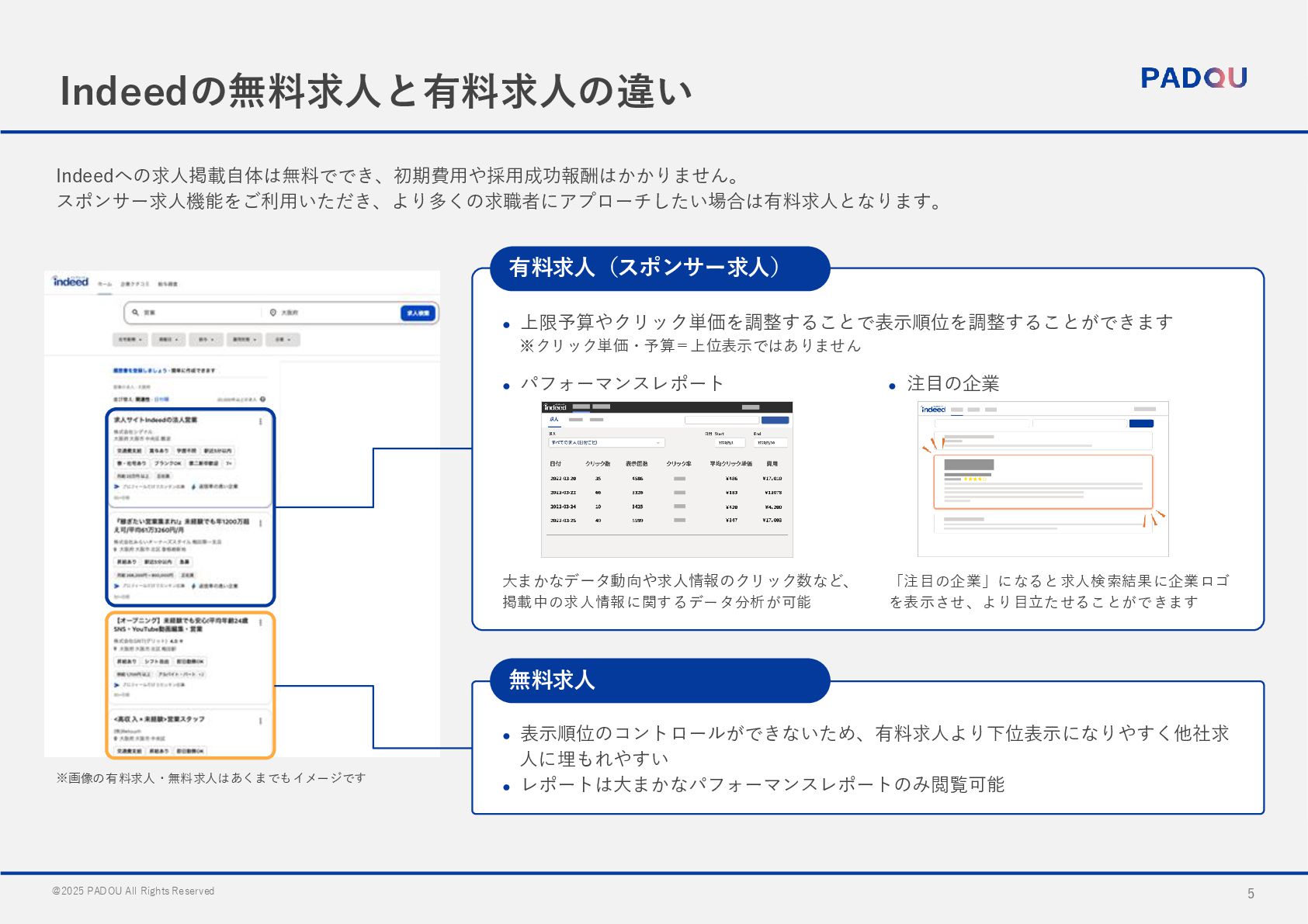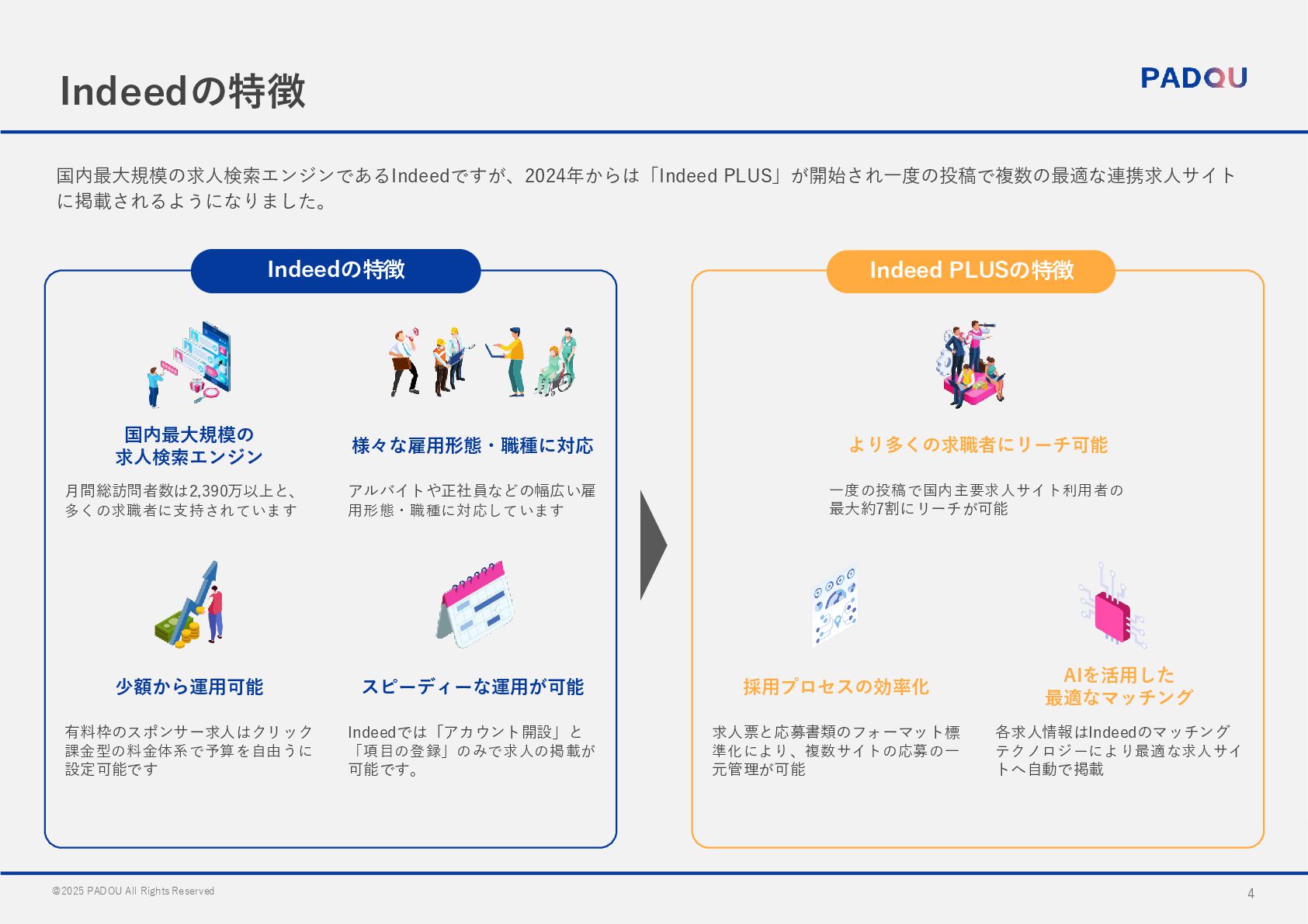 国内最大規模の 求人検索エンジン 様々な雇用形態・職種に対応 月間総訪問者数は2,390万以上と、 多くの求職者に支持されています アルバイトや正社員などの幅広い雇 用形態・職種に対応しています 少額から運用可能 スピーディーな運用が可能 有料枠のスポンサー求人はクリック 課金型の料金体系で予算を自由うに 設定可能です Indeedでは「アカウント開設」と 「項目の登録」のみで求人の掲載が 可能です。 より多くの求職者にリーチ可能 一度の投稿で国内主要求人サイト利用者の 最大約7割にリーチが可能 採用プロセスの効率化 AIを活用した 最適なマッチング 求人票と応募書類のフォーマット標 準化により、複数サイトの応募の一 元管理が可能 各求人情報はIndeedのマッチング テクノロジーにより最適な求人サイ トへ自動で掲載 Indeed PLUSの特徴 Indeedの特徴