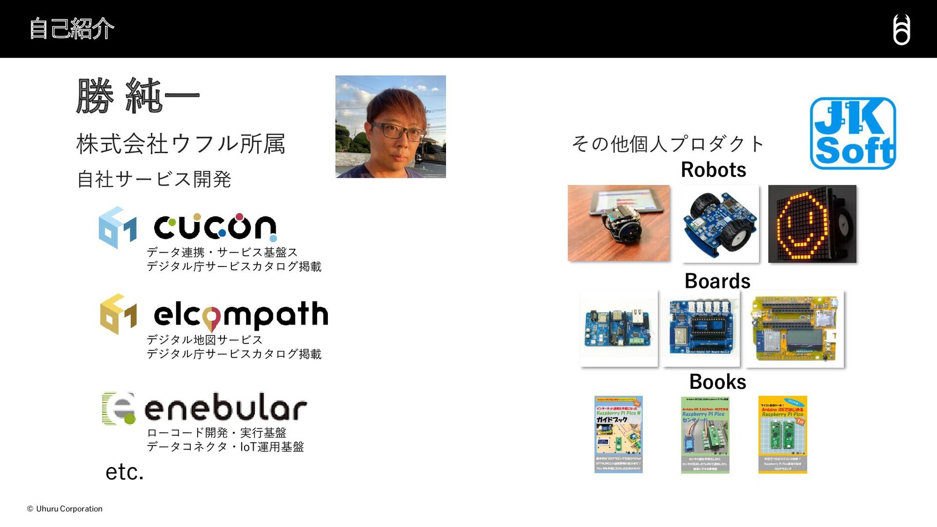 © Uhuru Corporation 勝 純一 株式会社ウフル所属 自社サービス開発 自己紹介 データ連携・サービス基盤ス デジタル庁サービスカタログ掲載