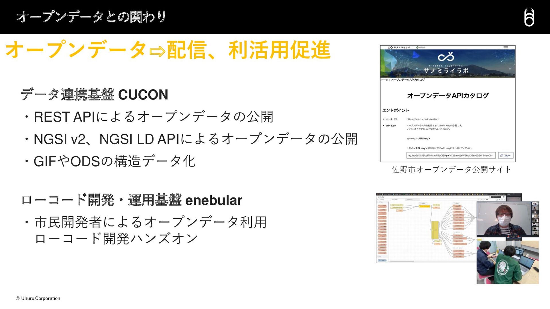 © Uhuru Corporation データ連携基盤 CUCON ・REST APIによるオープンデータの公開 ・NGSI v2、NGSI LD