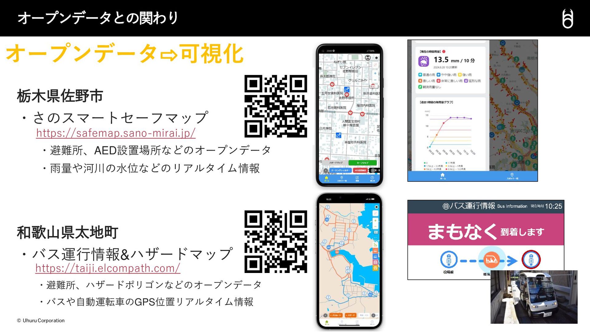 © Uhuru Corporation 栃木県佐野市 ・さのスマートセーフマップ ・避難所、AED設置場所などのオープンデータ ・雨量や河川の水位などのリアルタイム情報 和歌山県太地町 ・バス運行情報&ハザードマップ ・避難所、ハザードポリゴンなどのオープンデータ