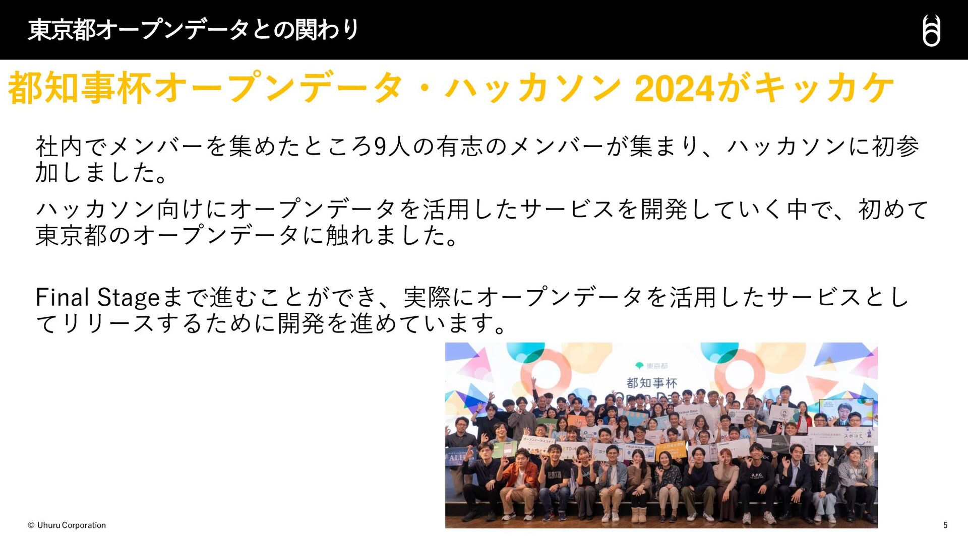 © Uhuru Corporation 社内でメンバーを集めたところ9人の有志のメンバーが集まり、ハッカソンに初参 加しました。 ハッカソン向けにオープンデータを活用したサービスを開発していく中で、初めて 東京都のオープンデータに触れました。 Final Stageまで進むことができ、実際にオープンデータを活用したサービスとし てリリースするために開発を進めています。