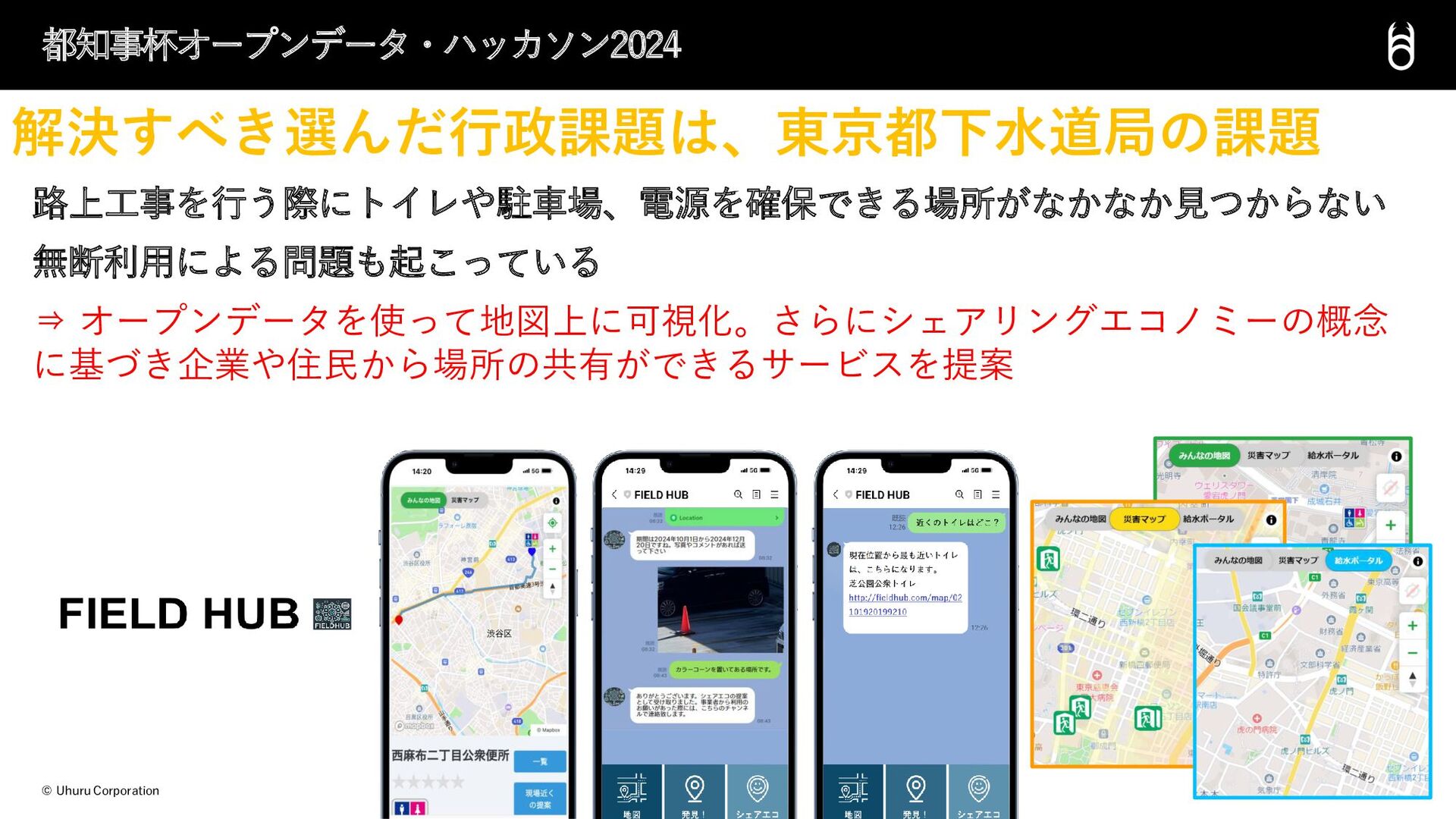 © Uhuru Corporation 路上工事を行う際にトイレや駐車場、電源を確保できる場所がなかなか見つからない 無断利用による問題も起こっている ⇒ オープンデータを使って地図上に可視化。さらにシェアリングエコノミーの概念 に基づき企業や住民から場所の共有ができるサービスを提案 都知事杯オープンデータ・ハッカソン2024 解決すべき選んだ行政課題は、東京都下水道局の課題