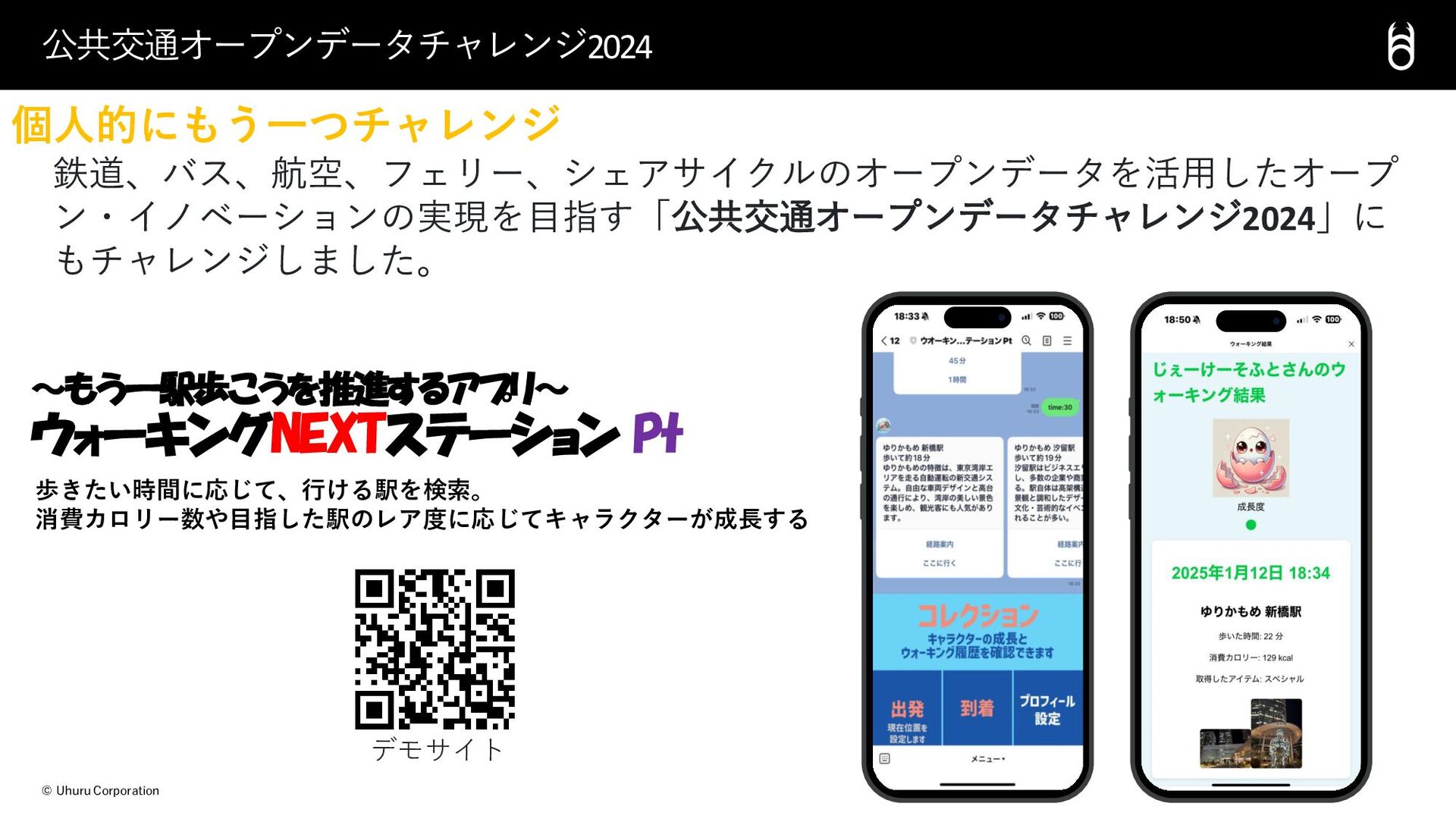 © Uhuru Corporation 鉄道、バス、航空、フェリー、シェアサイクルのオープンデータを活用したオープ ン・イノベーションの実現を目指す「公共交通オープンデータチャレンジ2024」に もチャレンジしました。 公共交通オープンデータチャレンジ2024 個人的にもう一つチャレンジ ~もう一駅歩こうを推進するアプリ~ ウォーキングNEXTステーション