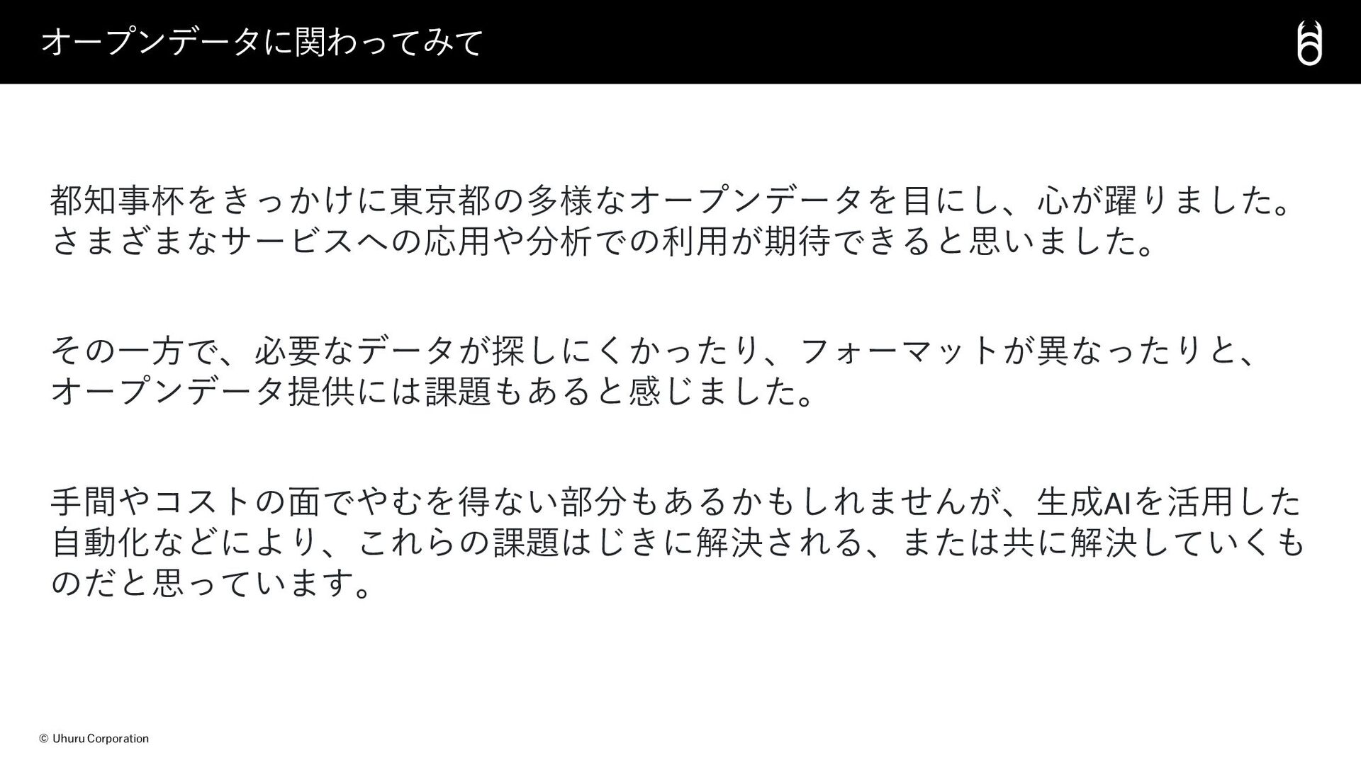 © Uhuru Corporation 都知事杯をきっかけに東京都の多様なオープンデータを目にし、心が躍りました。 さまざまなサービスへの応用や分析での利用が期待できると思いました。 その一方で、必要なデータが探しにくかったり、フォーマットが異なったりと、 オープンデータ提供には課題もあると感じました。 手間やコストの面でやむを得ない部分もあるかもしれませんが、生成AIを活用した 自動化などにより、これらの課題はじきに解決される、または共に解決していくも のだと思っています。