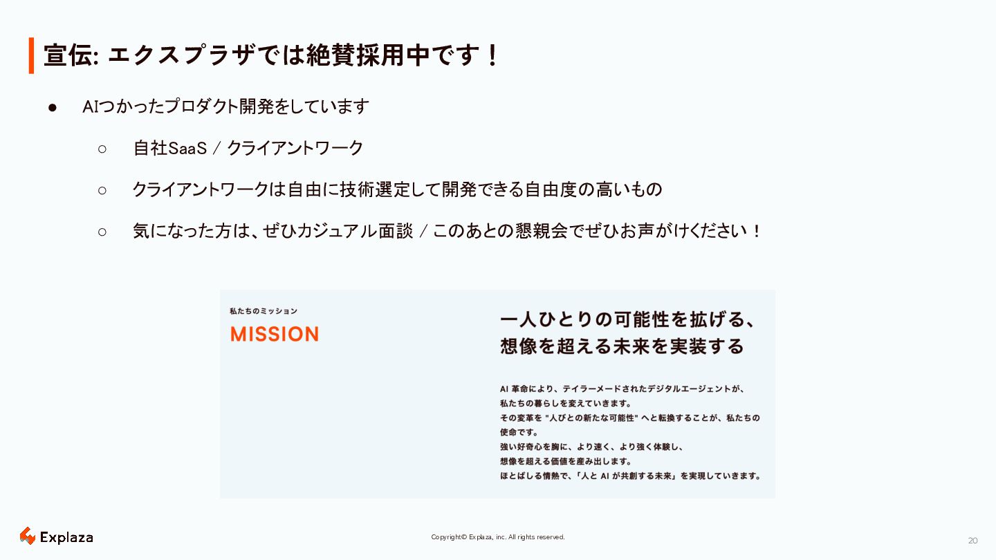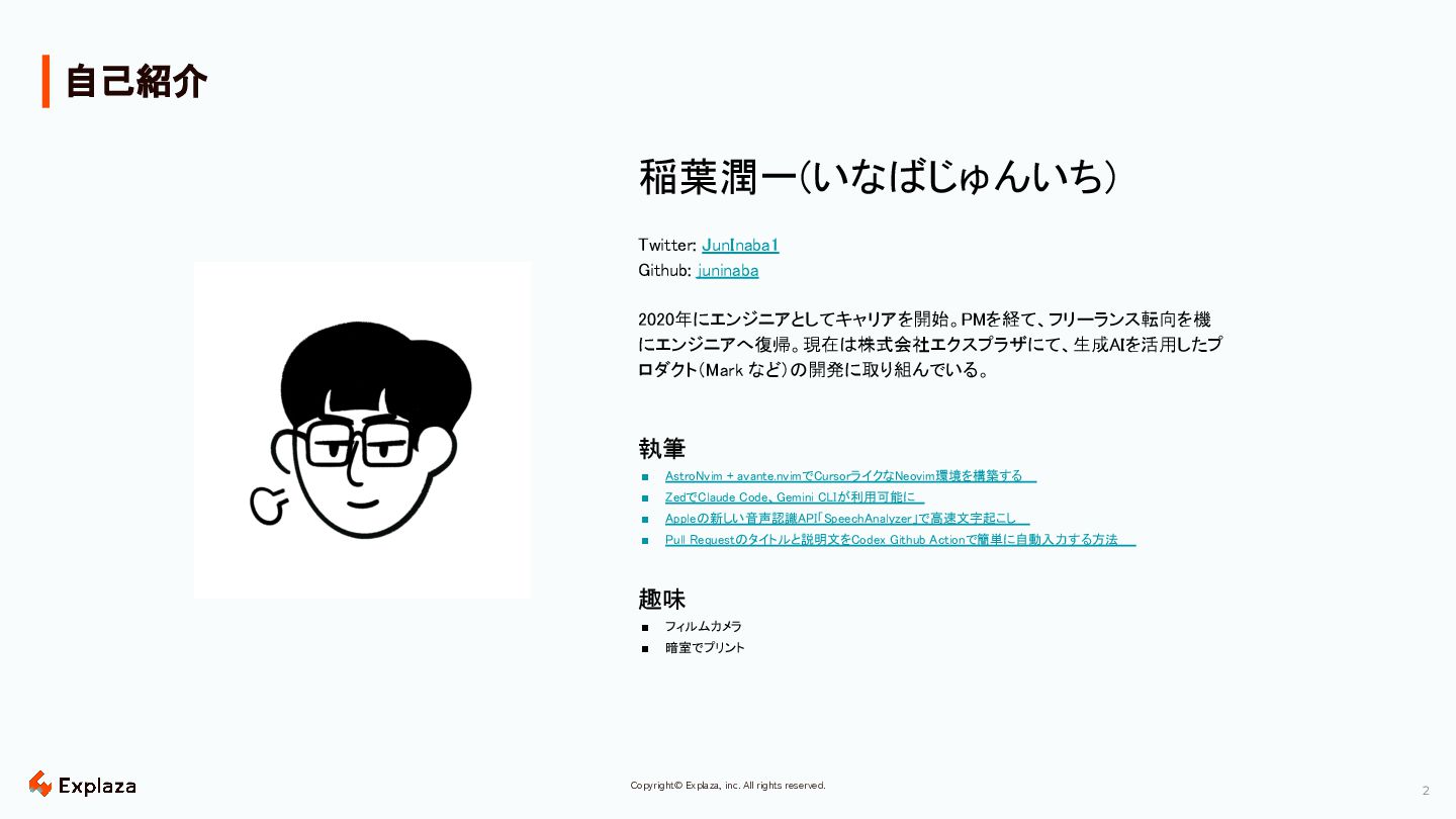 2020年にエンジニアとしてキャリアを開始。PMを経て、フリーランス転向を機 にエンジニアへ復帰。現在は株式会社エクスプラザにて、生成AIを活用したプ ロダクト(Mark など)の開発に取り組んでいる。