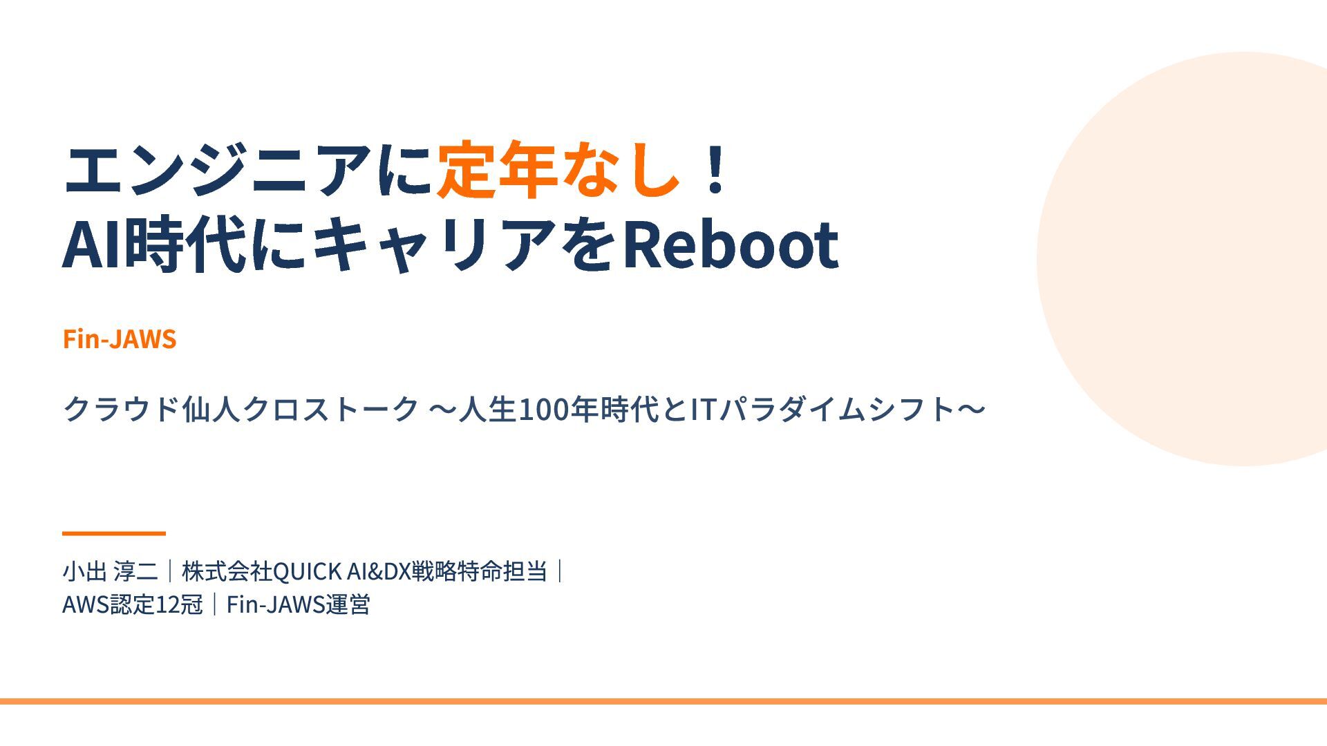 Fin-JAWS エンジニアに定年なし! AI時代にキャリアをReboot クラウド仙人クロストーク 〜人生100年時代とITパラダイムシフト〜 小出 淳二|株式会社QUICK AI&DX戦略特命担当| AWS認定12冠|Fin-JAWS運営