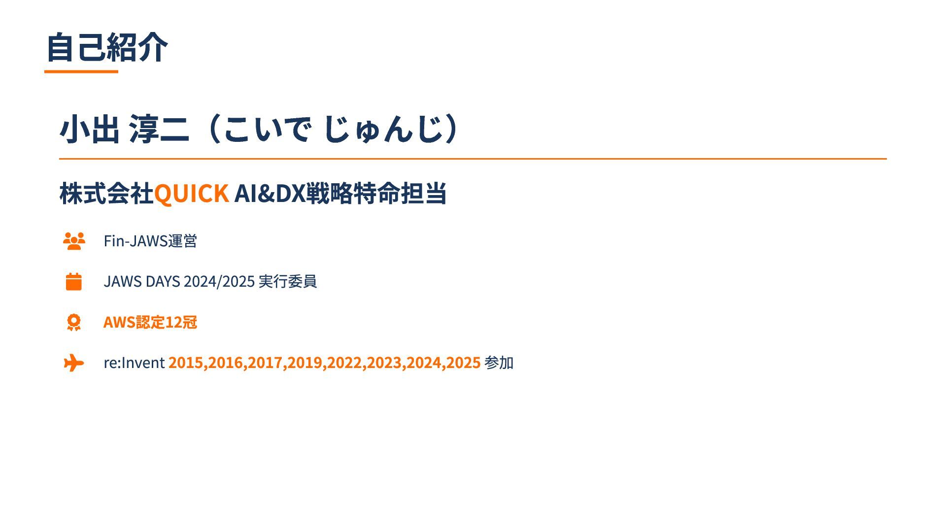 自己紹介 小出 淳二(こいで じゅんじ) 株式会社QUICK AI&DX戦略特命担当 Fin-JAWS運営 JAWS