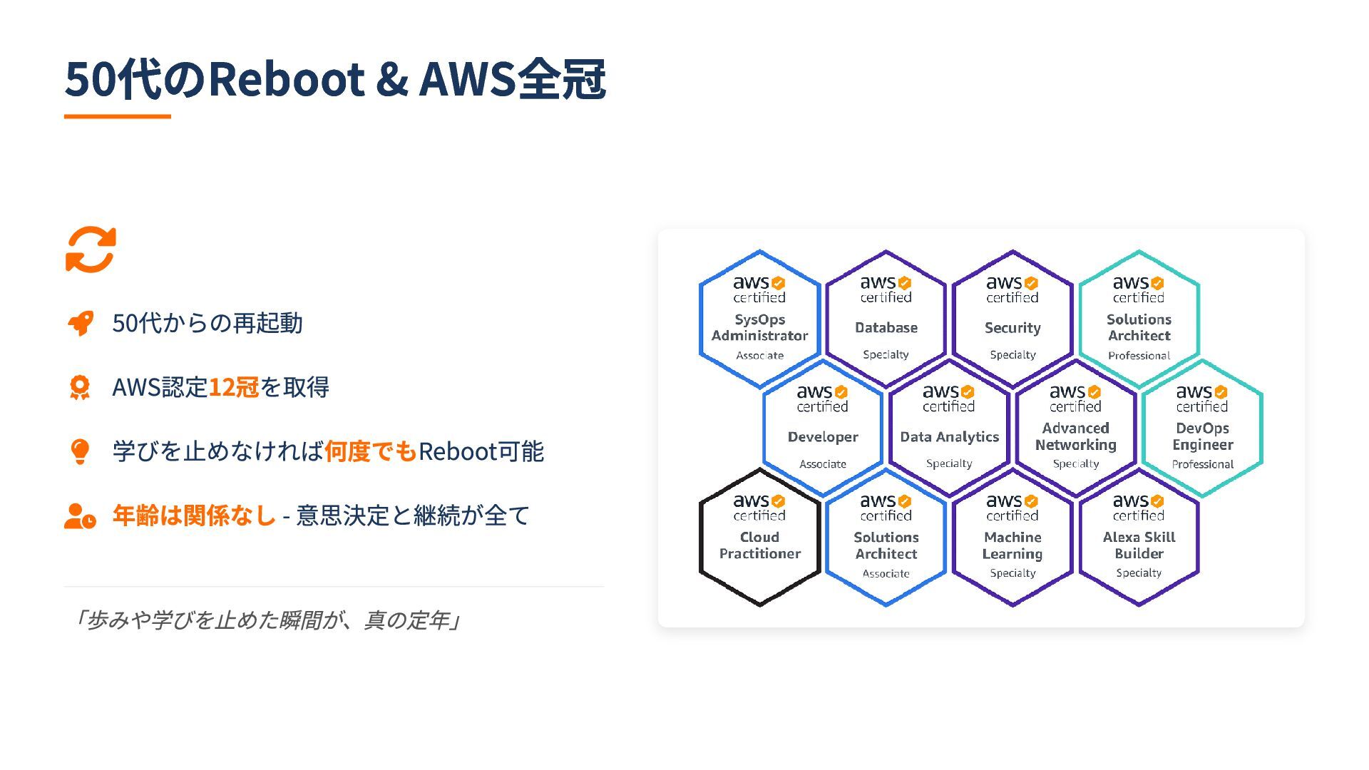 50代のReboot & AWS全冠 50代からの再起動 AWS認定12冠を取得 学びを止めなければ何度でもReboot可能