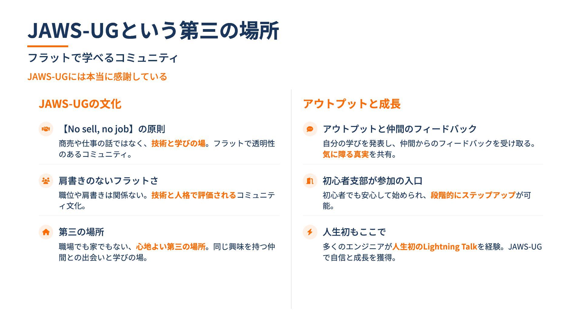 のあるコミュニティ。 肩書きのないフラットさ 職位や肩書きは関係ない。技術と人格で評価されるコミュニテ ィ文化。 第三の場所 職場でも家でもない、心地よい第三の場所。同じ興味を持つ仲 間との出会いと学びの場。 アウトプットと成長 アウトプットと仲間のフィードバック 自分の学びを発表し、仲間からのフィードバックを受け取る。 気に障る真実を共有。 初心者支部が参加の入口 初心者でも安心して始められ、段階的にステップアップが可 能。 人生初もここで 多くのエンジニアが人生初のLightning Talkを経験。JAWS-UG で自信と成長を獲得。