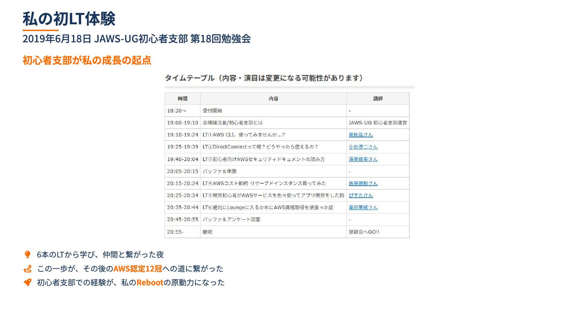 2019年6月18日 JAWS-UG初心者支部 第18回勉強会 私の初LT体験 初心者支部が私の成長の起点 6本のLTから学び、仲間と繋がった夜 この一歩が、その後のAWS認定12冠への道に繋がった