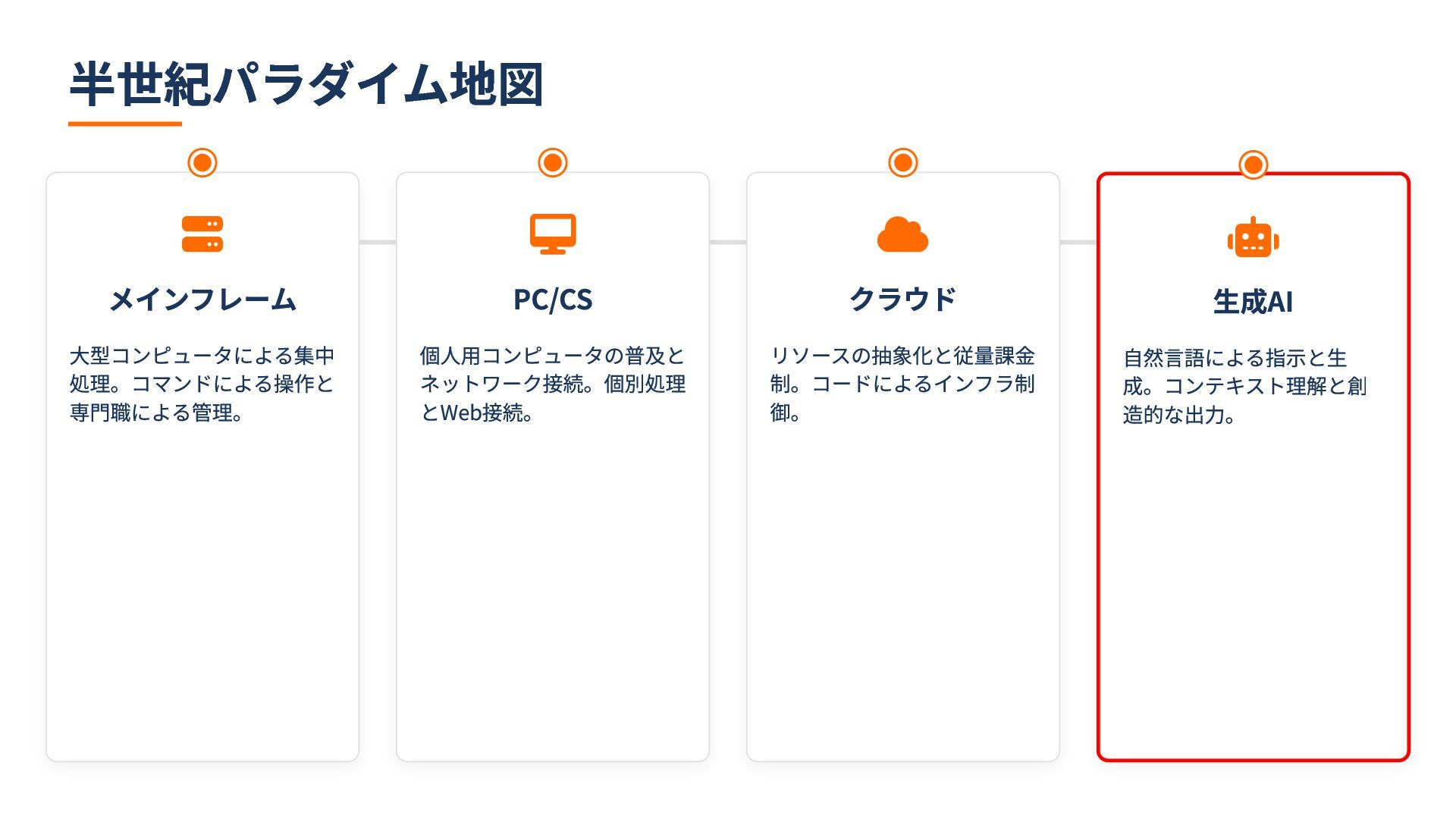 個人用コンピュータの普及と ネットワーク接続。個別処理 とWeb接続。 クラウド リソースの抽象化と従量課金 制。コードによるインフラ制 御。 生成AI 自然言語による指示と生 成。コンテキスト理解と創 造的な出力。