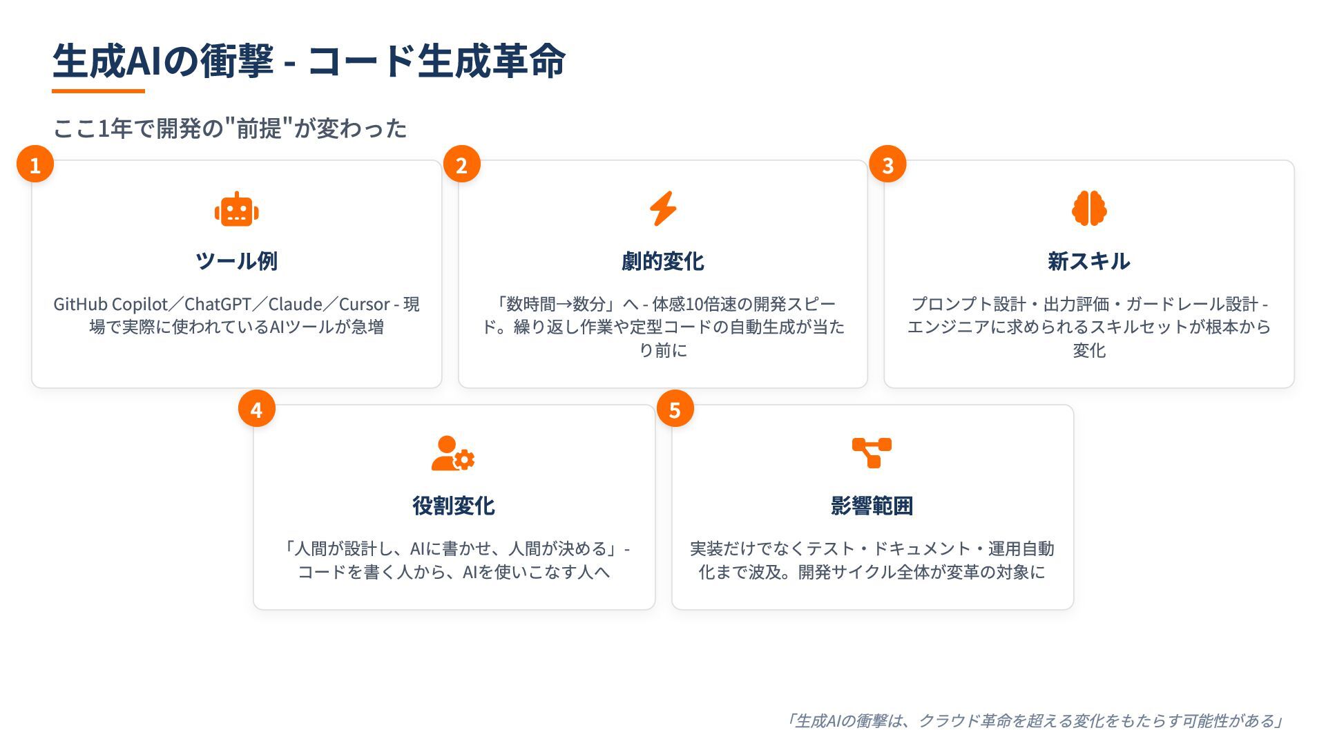 場で実際に使われているAIツールが急増 1 劇的変化 「数時間→数分」へ - 体感10倍速の開発スピー ド。繰り返し作業や定型コードの自動生成が当た り前に 2 新スキル プロンプト設計・出力評価・ガードレール設計 - エンジニアに求められるスキルセットが根本から 変化 3 役割変化 「人間が設計し、AIに書かせ、人間が決める」- コードを書く人から、AIを使いこなす人へ 4 影響範囲 実装だけでなくテスト・ドキュメント・運用自動 化まで波及。開発サイクル全体が変革の対象に 5 「生成AIの衝撃は、クラウド革命を超える変化をもたらす可能性がある」