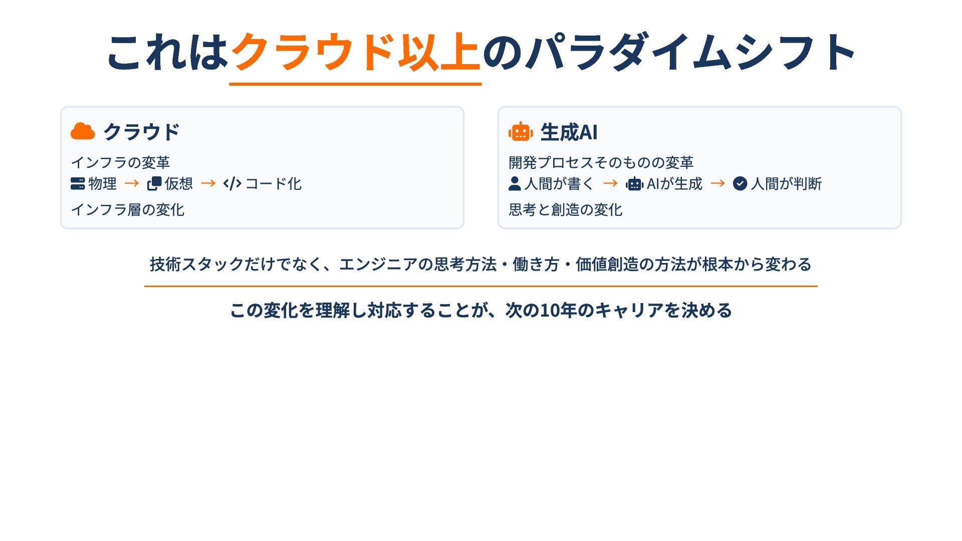 コード化 インフラ層の変化 生成AI 開発プロセスそのものの変革 人間が書く → AIが生成 → 人間が判断 思考と創造の変化 技術スタックだけでなく、エンジニアの思考方法・働き方・価値創造の方法が根本から変わる この変化を理解し対応することが、次の10年のキャリアを決める