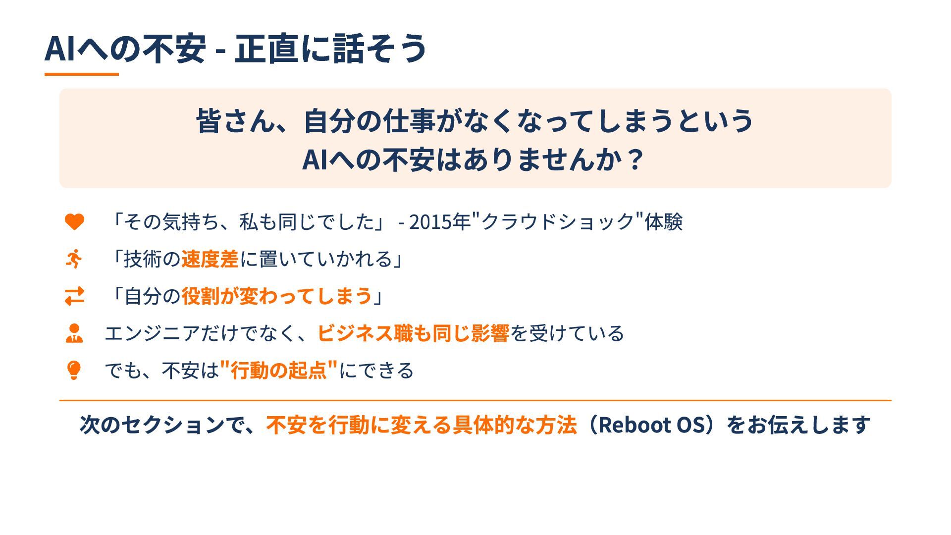 「技術の速度差に置いていかれる」 「自分の役割が変わってしまう」 エンジニアだけでなく、ビジネス職も同じ影響を受けている でも、不安は"行動の起点"にできる 次のセクションで、不安を行動に変える具体的な方法(Reboot OS)をお伝えします