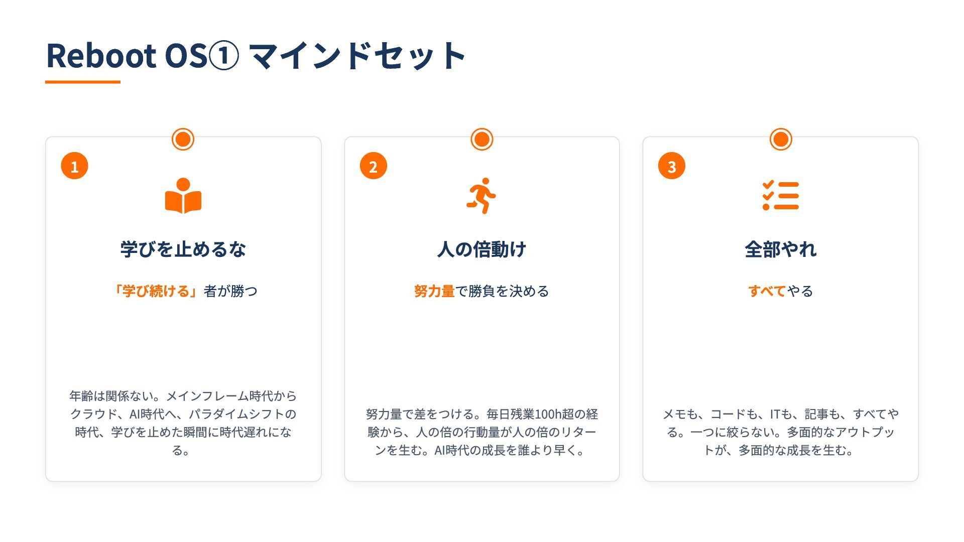 1 人の倍動け 努力量で勝負を決める 努力量で差をつける。毎日残業100h超の経 験から、人の倍の行動量が人の倍のリター ンを生む。AI時代の成長を誰より早く。 2 全部やれ すべてやる メモも、コードも、ITも、記事も、すべてや る。一つに絞らない。多面的なアウトプッ トが、多面的な成長を生む。 3