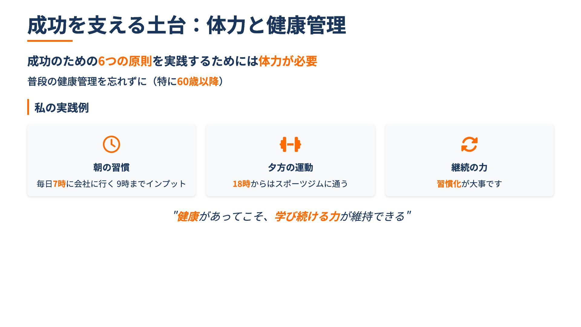 成功を支える土台:体力と健康管理 成功のための6つの原則を実践するためには体力が必要 普段の健康管理を忘れずに(特に60歳以降) 私の実践例 朝の習慣 毎日7時に会社に行く 9時までインプット 夕方の運動