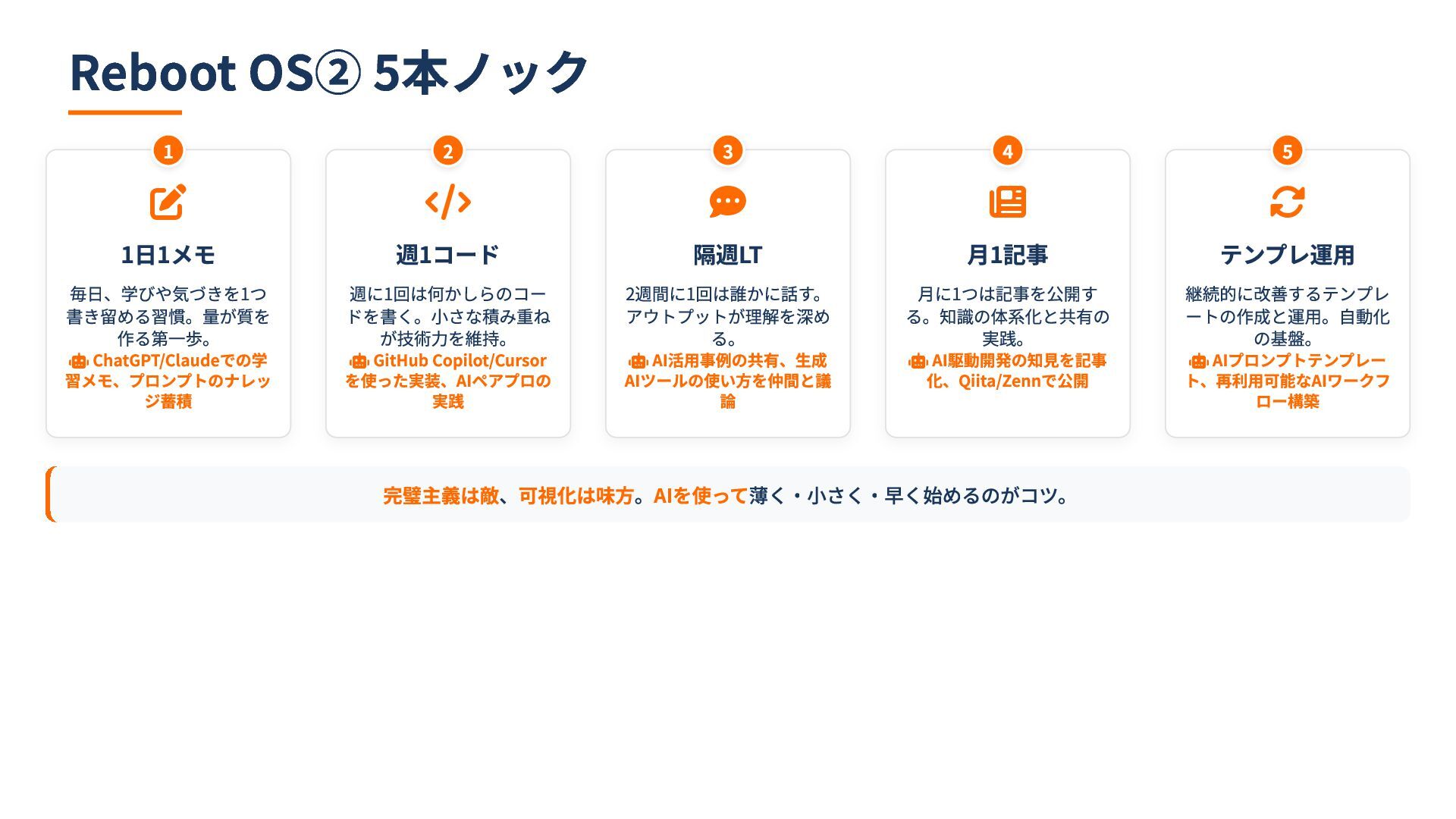 ChatGPT/Claudeでの学 習メモ、プロンプトのナレッ ジ蓄積 1 週1コード 週に1回は何かしらのコー ドを書く。小さな積み重ね が技術力を維持。 GitHub Copilot/Cursor を使った実装、AIペアプロの 実践 2 隔週LT 2週間に1回は誰かに話す。 アウトプットが理解を深め る。 AI活用事例の共有、生成 AIツールの使い方を仲間と議 論 3 月1記事 月に1つは記事を公開す る。知識の体系化と共有の 実践。 AI駆動開発の知見を記事 化、Qiita/Zennで公開 4 テンプレ運用 継続的に改善するテンプレ ートの作成と運用。自動化 の基盤。 AIプロンプトテンプレー ト、再利用可能なAIワークフ ロー構築 5