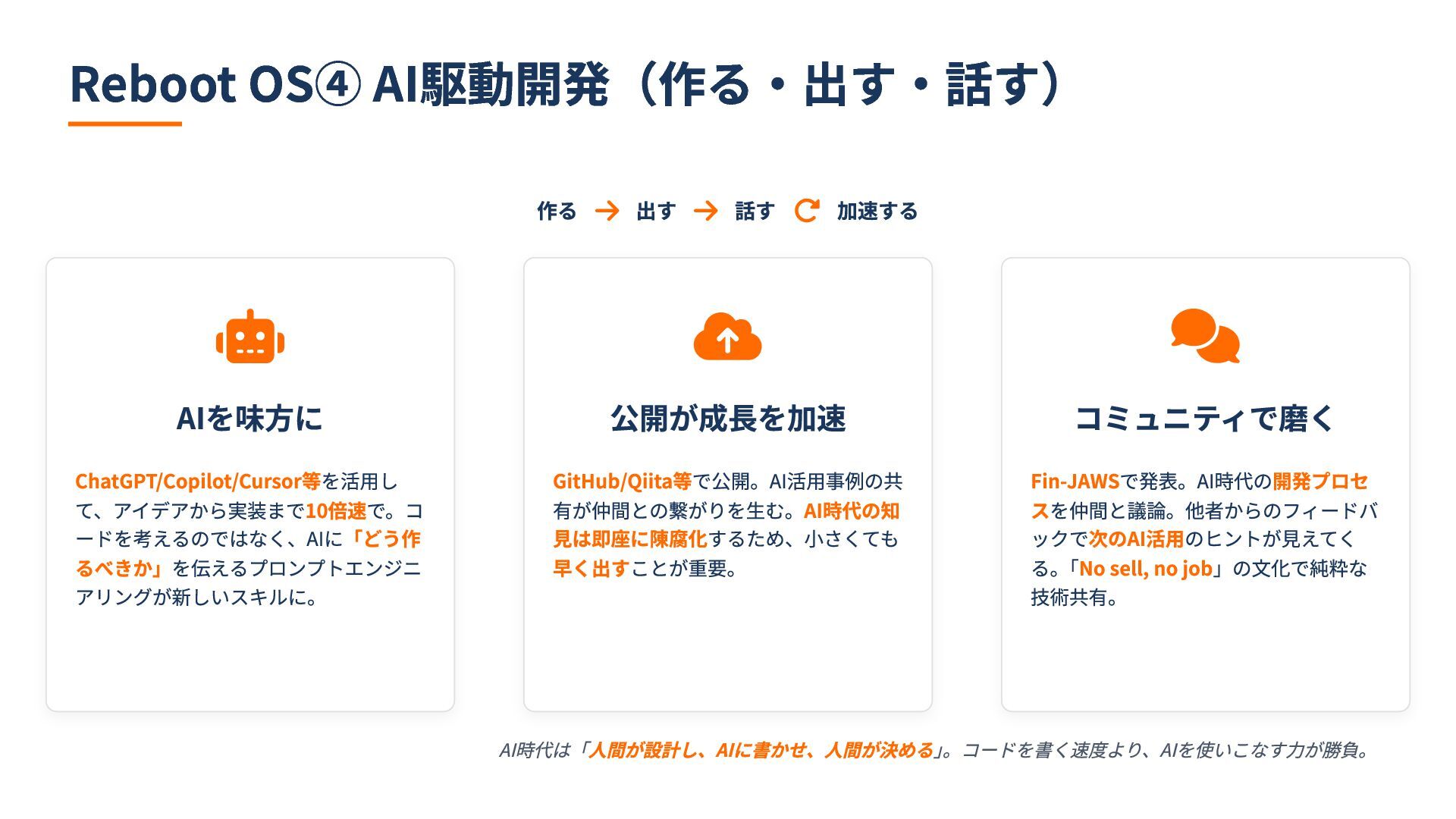 加速する AIを味方に ChatGPT/Copilot/Cursor等を活用し て、アイデアから実装まで10倍速で。コ ードを考えるのではなく、AIに「どう作 るべきか」を伝えるプロンプトエンジニ アリングが新しいスキルに。 公開が成長を加速 GitHub/Qiita等で公開。AI活用事例の共 有が仲間との繋がりを生む。AI時代の知 見は即座に陳腐化するため、小さくても 早く出すことが重要。 コミュニティで磨く Fin-JAWSで発表。AI時代の開発プロセ スを仲間と議論。他者からのフィードバ ックで次のAI活用のヒントが見えてく る。 「No sell, no job」の文化で純粋な 技術共有。