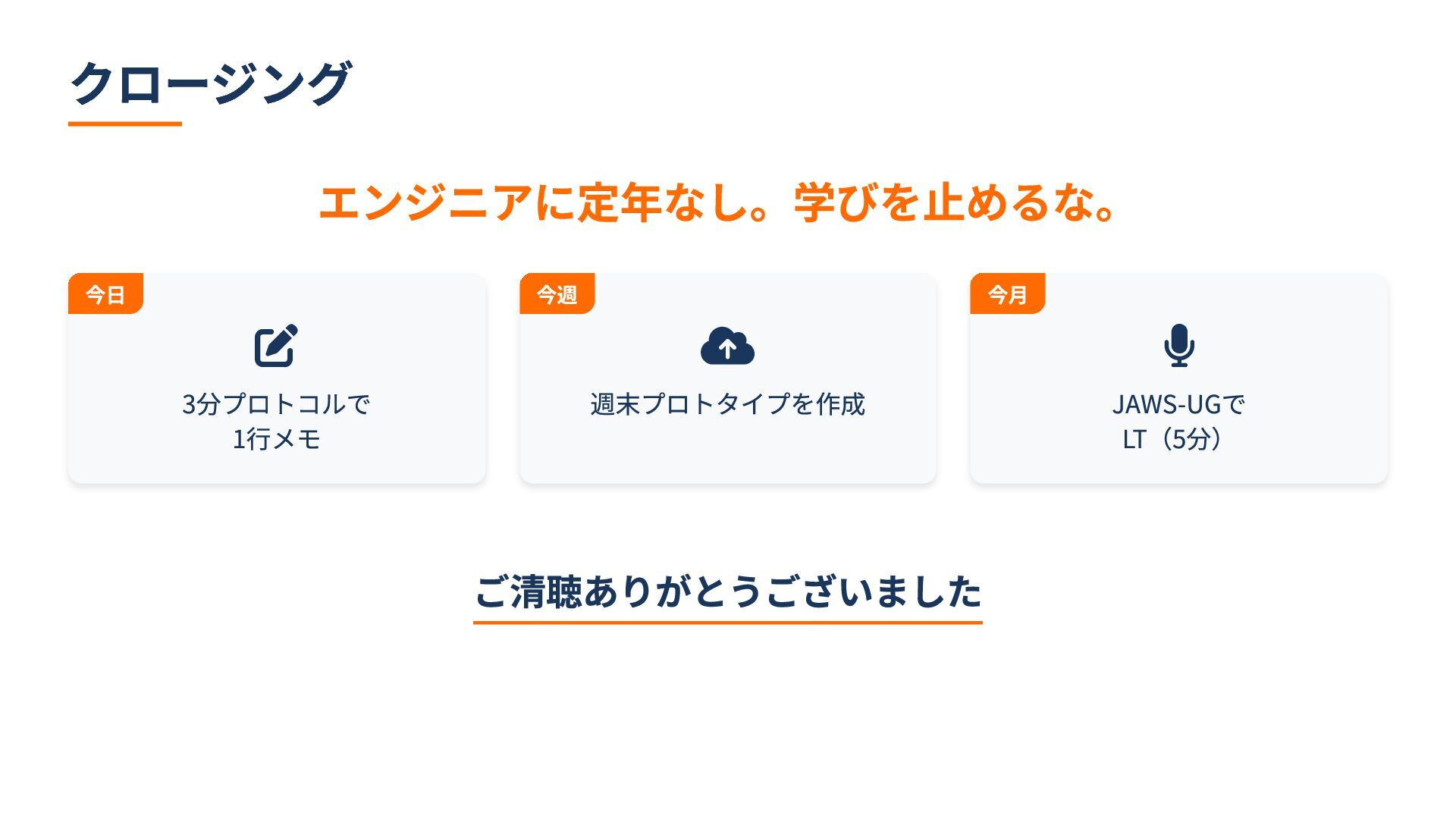 クロージング エンジニアに定年なし。学びを止めるな。 3分プロトコルで 1行メモ 今日 週末プロトタイプを作成 今週