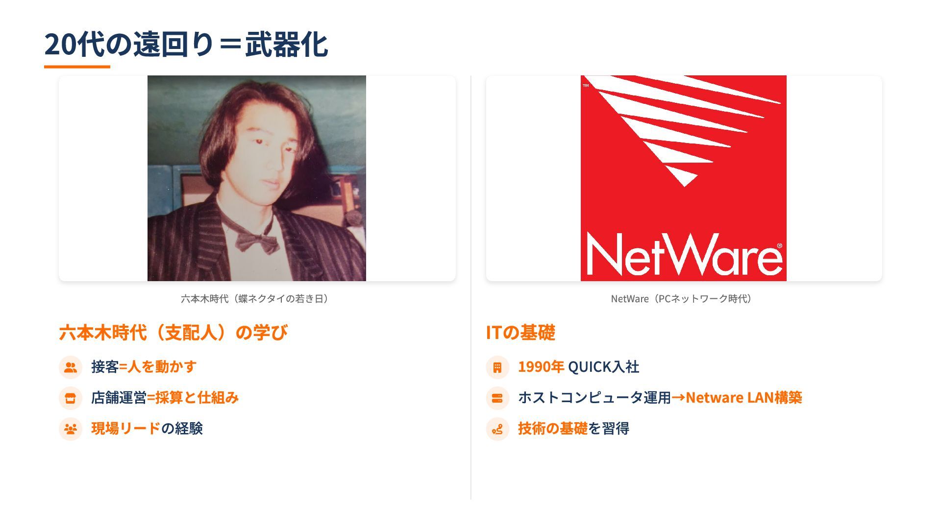 20代の遠回り=武器化 六本木時代(蝶ネクタイの若き日) 六本木時代(支配人)の学び 接客=人を動かす 店舗運営=採算と仕組み 現場リードの経験 NetWare(PCネットワーク時代)
