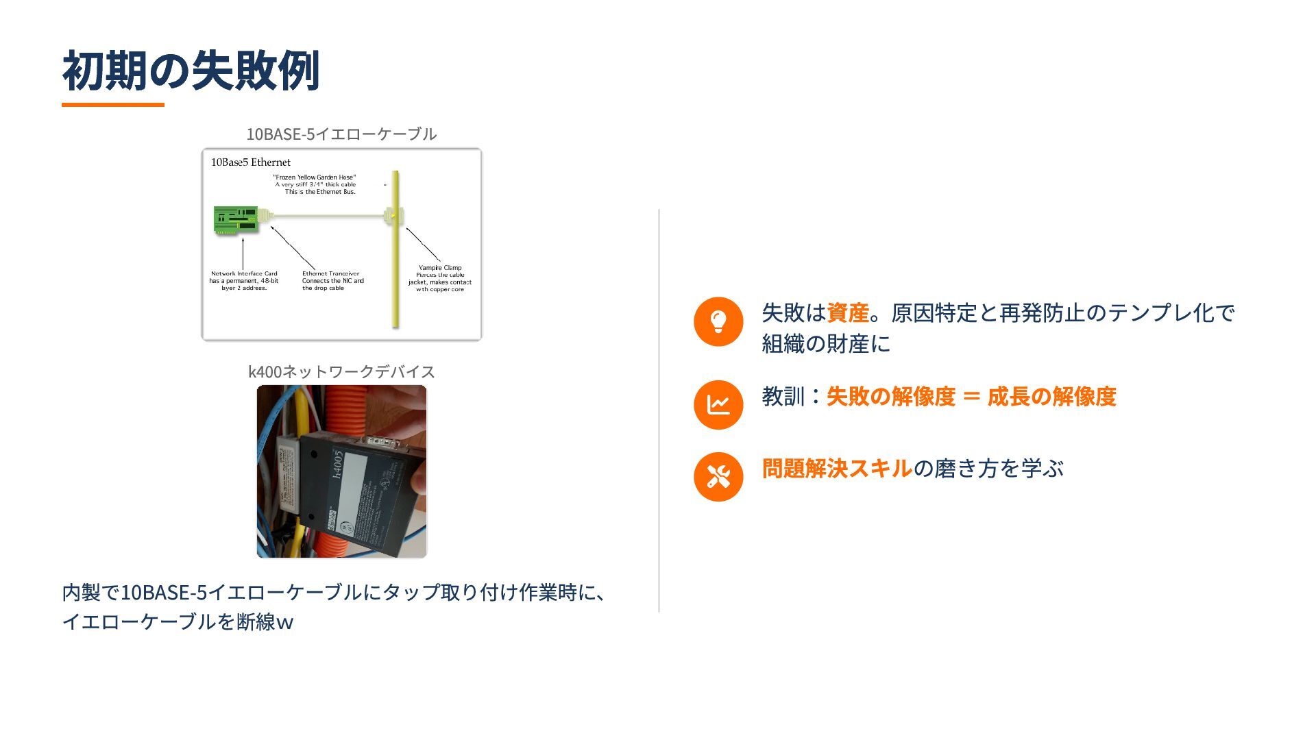 10BASE-5イエローケーブル k400ネットワークデバイス 内製で10BASE-5イエローケーブルにタップ取り付け作業時に、 イエローケーブルを断線w 初期の失敗例 失敗は資産。原因特定と再発防止のテンプレ化で 組織の財産に 教訓:失敗の解像度
