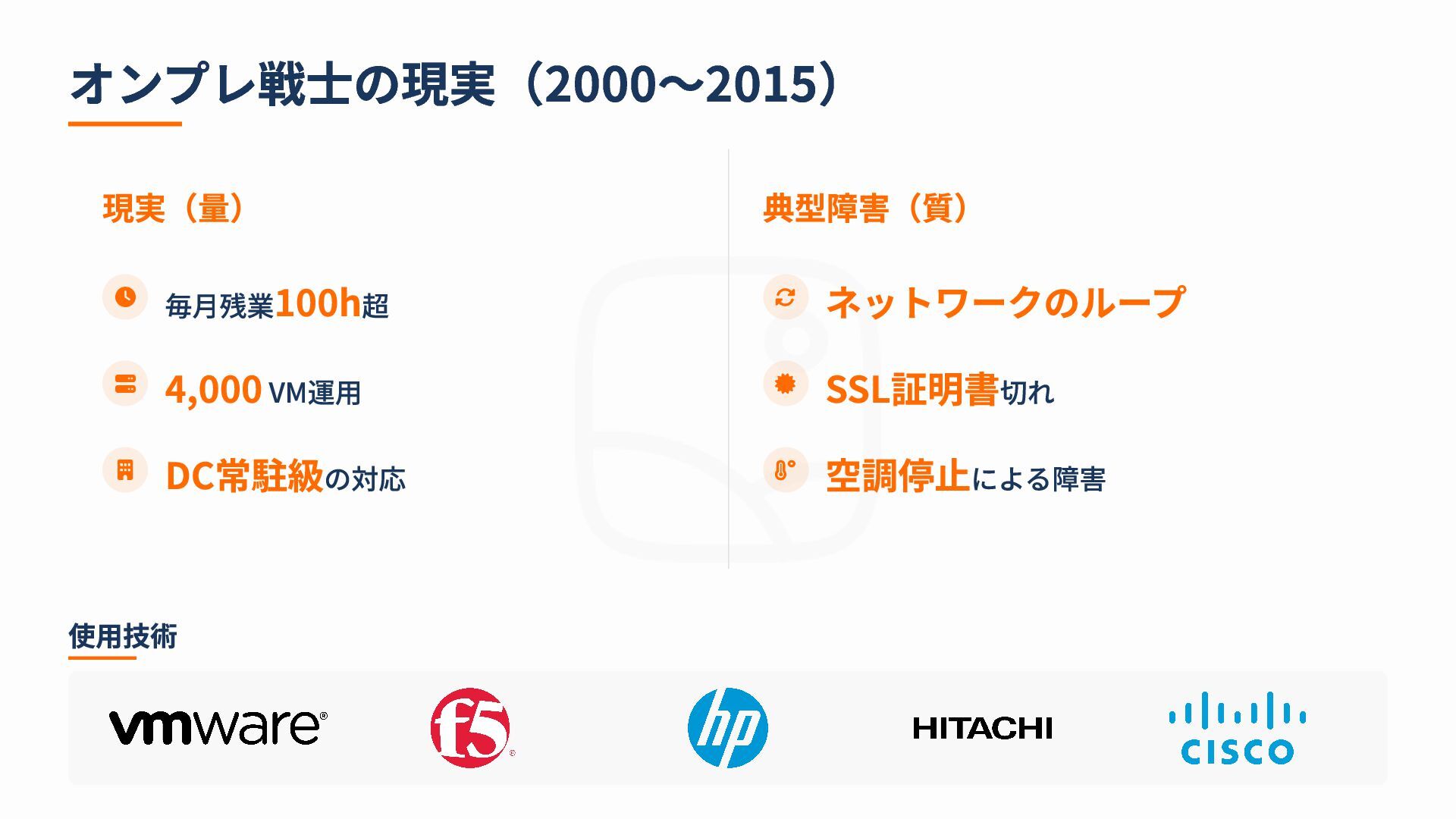 オンプレ戦士の現実(2000~2015) 現実(量) 毎月残業100h超 4,000 VM運用 DC常駐級の対応 典型障害(質)