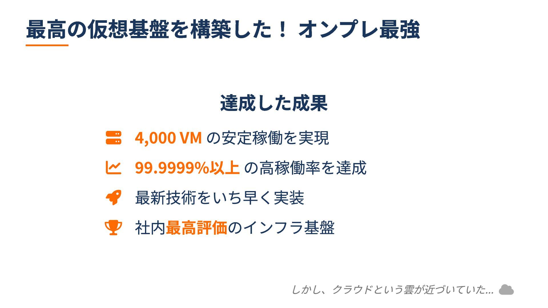 最高の仮想基盤を構築した! オンプレ最強 達成した成果 4,000 VM の安定稼働を実現 99.9999%以上 の高稼働率を達成