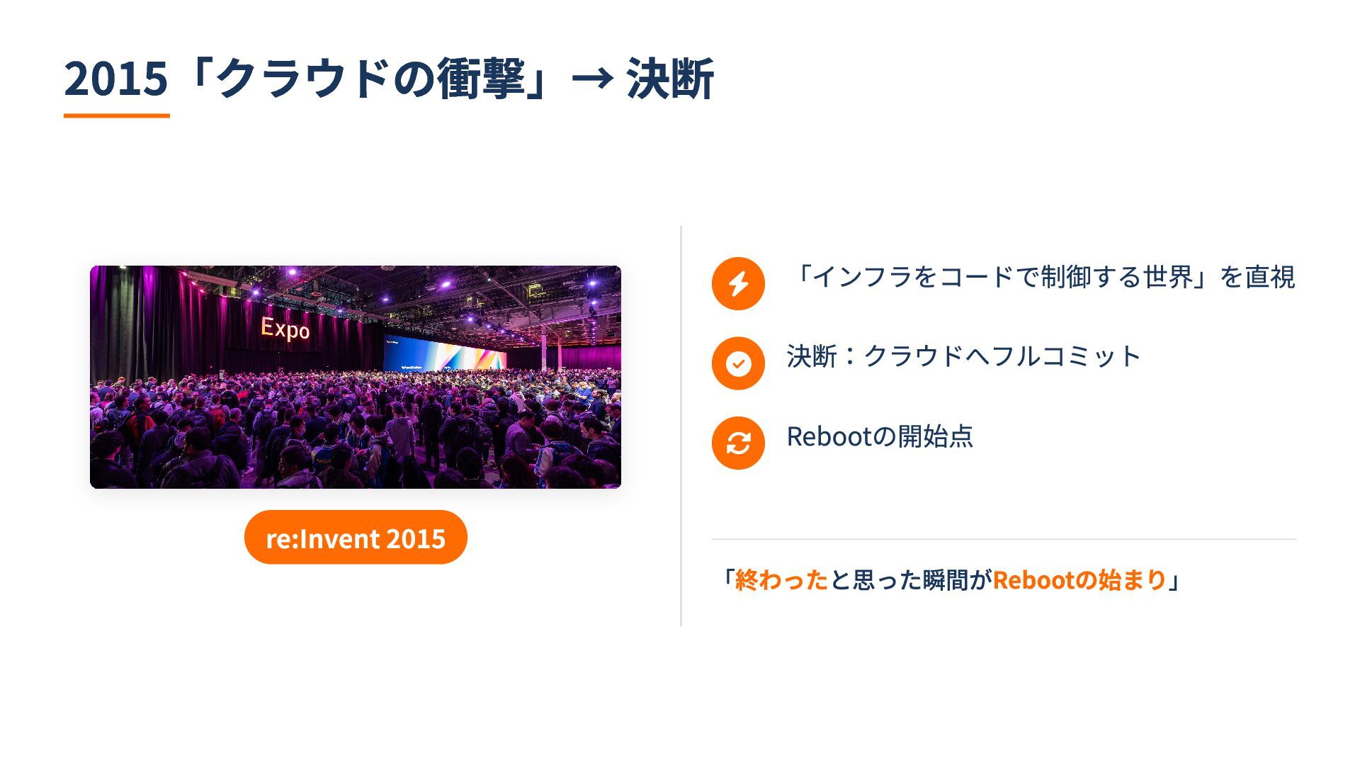 2015「クラウドの衝撃」→ 決断 re:Invent 2015 「インフラをコードで制御する世界」を直視 決断:クラウドへフルコミット Rebootの開始点