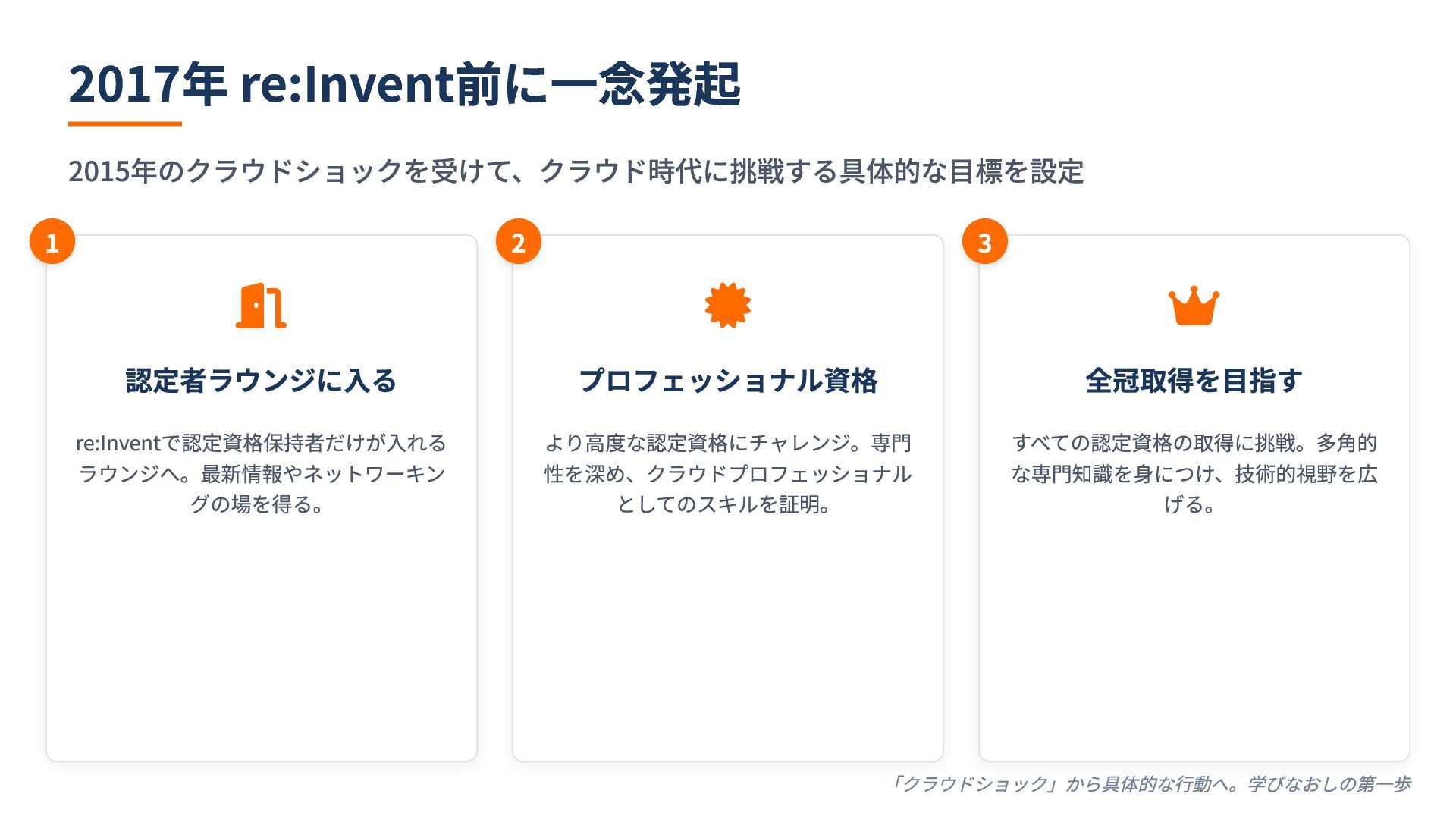 2015年のクラウドショックを受けて、クラウド時代に挑戦する具体的な目標を設定 2017年 re:Invent前に一念発起 「クラウドショック」から具体的な行動へ。学びなおしの第一歩 認定者ラウンジに入る re:Inventで認定資格保持者だけが入れる ラウンジへ。最新情報やネットワーキン グの場を得る。 1