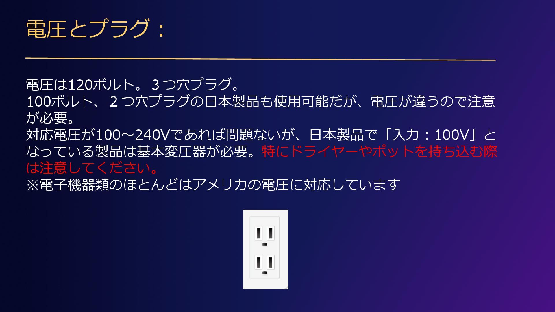 電圧とプラグ: 電圧は120ボルト。3つ穴プラグ。 100ボルト、2つ穴プラグの日本製品も使用可能だが、電圧が違うので注意 が必要。 対応電圧が100〜240Vであれば問題ないが、日本製品で「入力:100V」と なっている製品は基本変圧器が必要。特にドライヤーやポットを持ち込む際 は注意してください。 ※電子機器類のほとんどはアメリカの電圧に対応しています